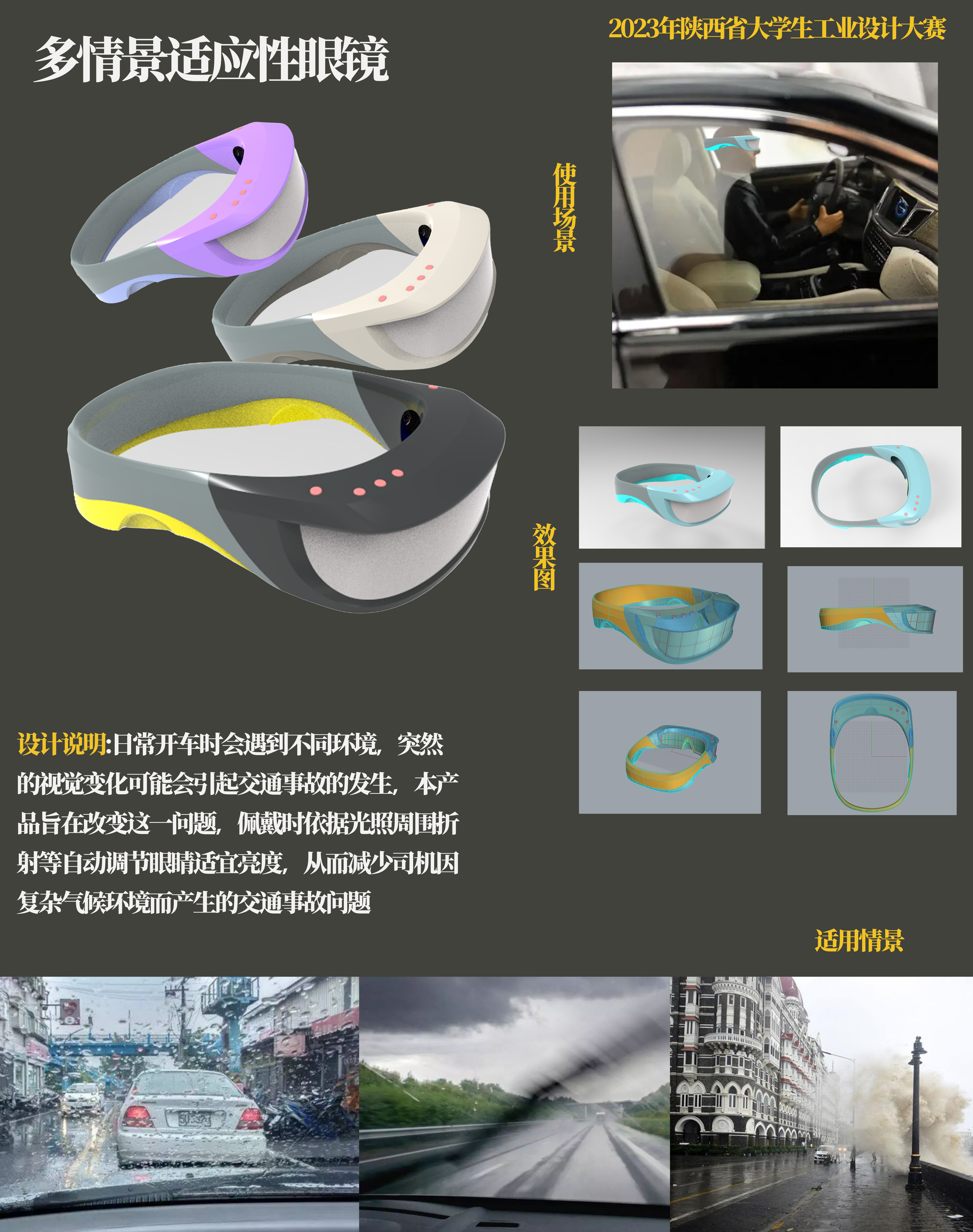 设计说明:日常开车时会遇到不同环境,突然的视觉变化可能会引起交通事故的发生,本产品旨在改变这一问题,佩戴时依据光照周围折射等自动调节眼睛适宜亮度,从而减少司机因复杂气候环境而产生的交通事故问题