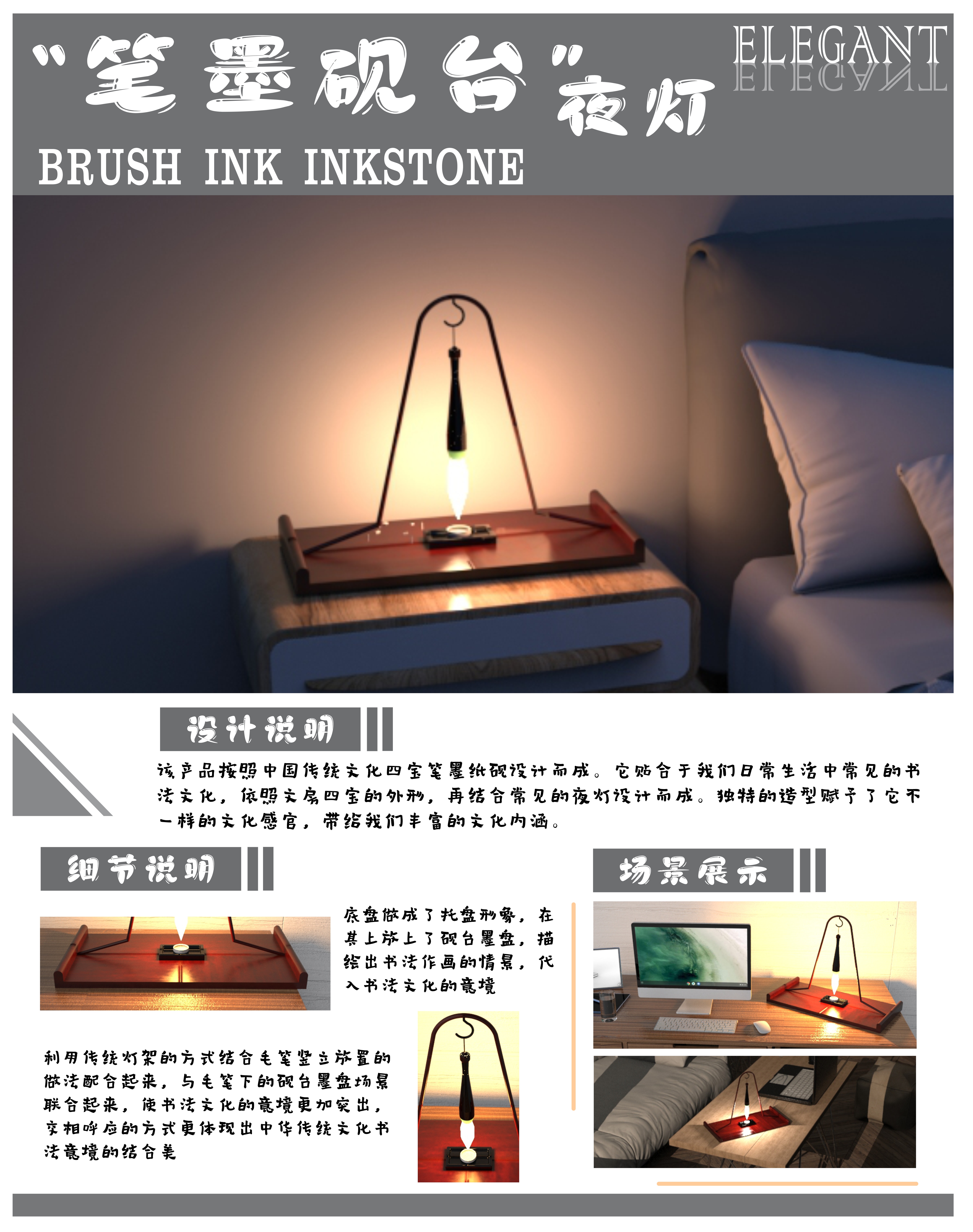 该产品按照中国传统文化四宝笔墨纸砚设计而成。它贴合于我们日常生活中常见的书法文化,依照文房四宝的外形,再结合常见的夜灯设计而成。独特的造型赋予了它不一样的文化感官,带给我们丰富的文化内涵。