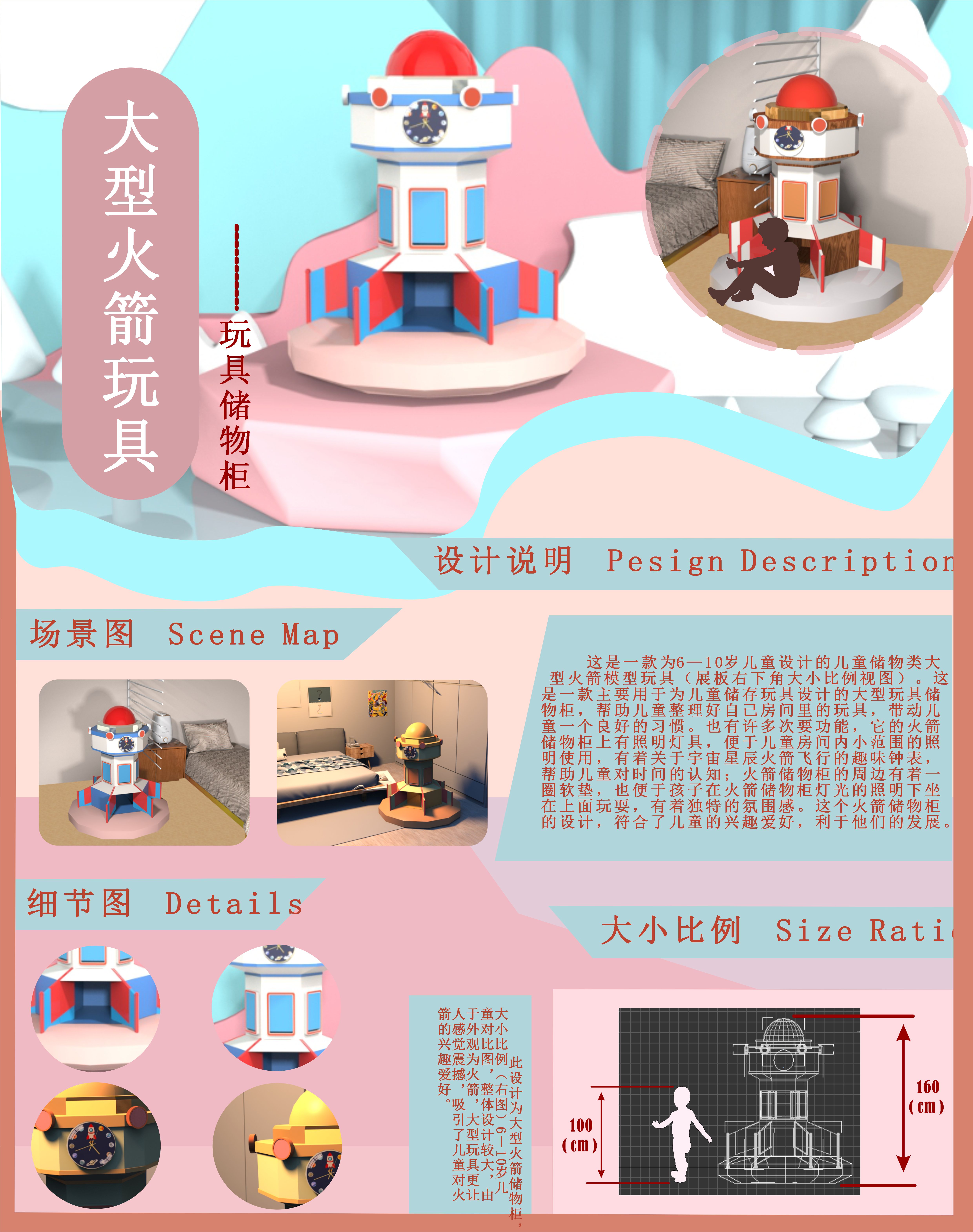 这是一款为6—10岁儿童设计的儿童储物类大型火箭玩具。这是一款主要用于为儿童储存玩具设计的大型玩具储物柜,帮助儿童整理好自己房间里的玩具,带动儿童一个良好的习惯。它的火箭储物柜上有照明 灯具,便于儿童房间内小范围的照明使用,有着关于宇宙星辰火箭飞行的趣味钟表,帮助儿童对时间的认知。