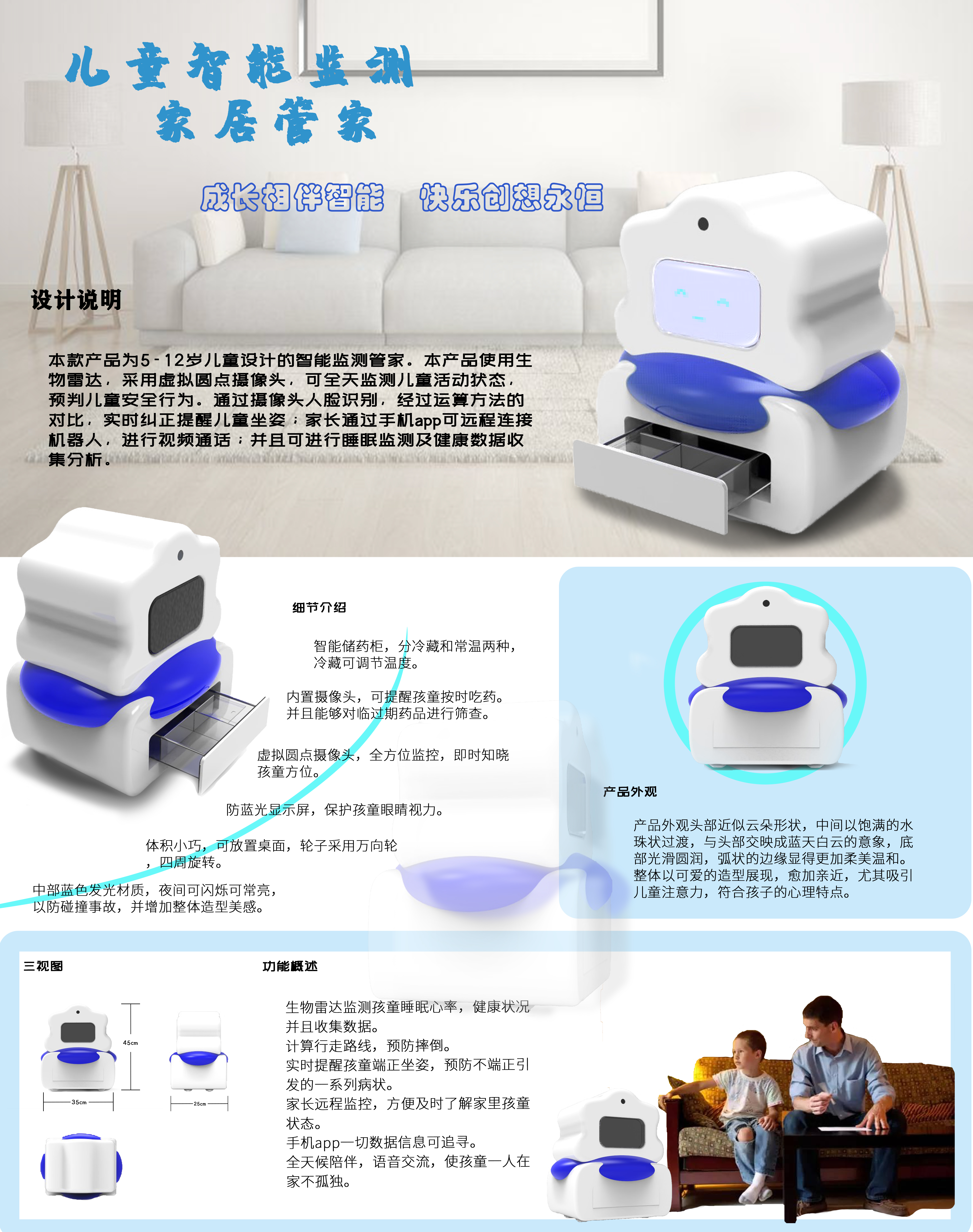 本款产品为5-12岁儿童设计的智能监测管家。本产品使用生物雷达,采用虚拟圆点摄像头,可全天监测儿童活动状态,预判儿童安全行为。通过摄像头人脸识别,经过运算方法的对比,实时纠正提醒儿童坐姿;家长通过手机app可远程连接机器人,进行视频通话;并且可进行睡眠监测及健康数据收集分析。头部近似云朵形状,中间以饱满的水珠状过渡,底部光滑圆润,弧状的边缘显得更加柔美。整体以可爱的造型展现符合孩子的心理特点。