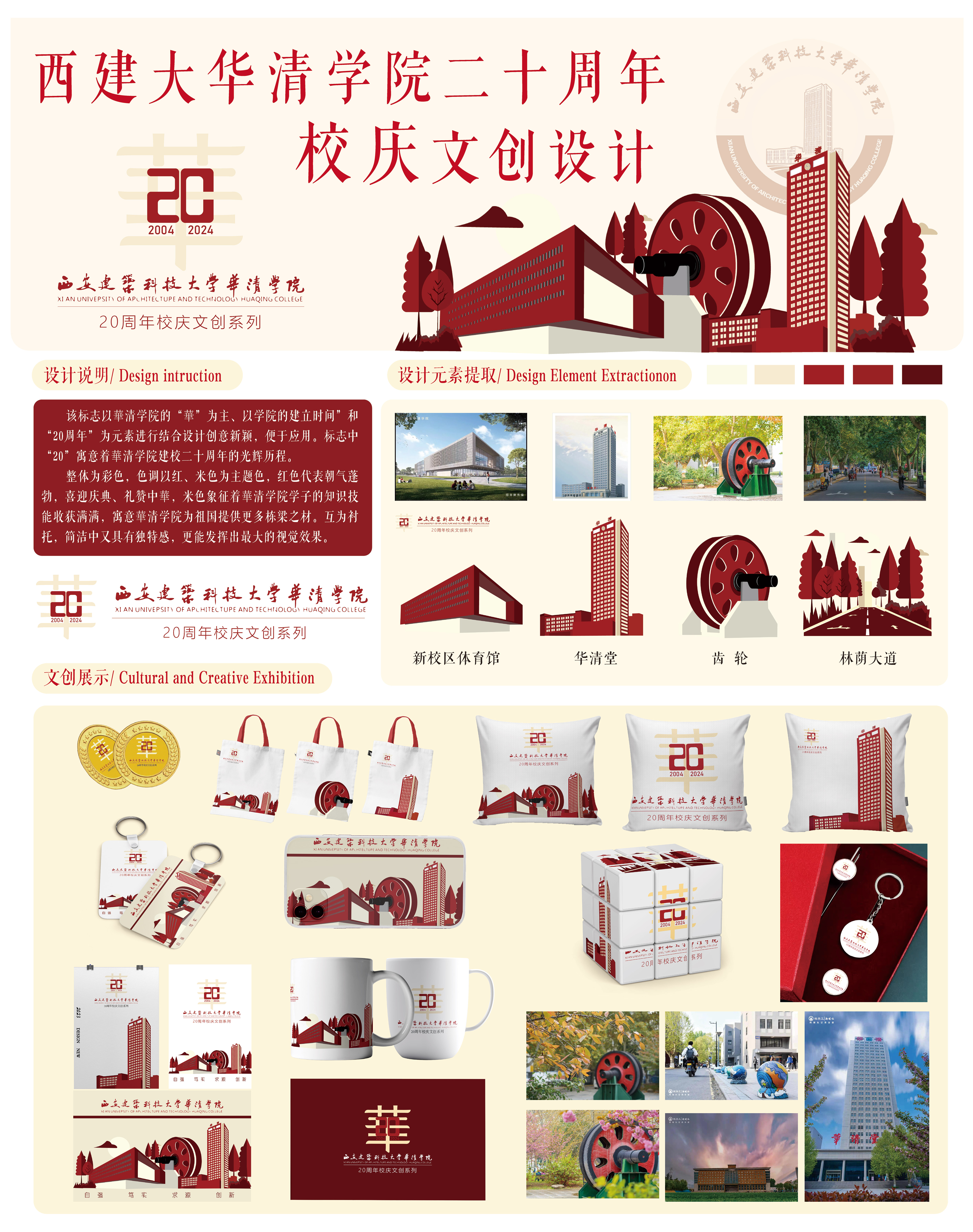 该标志以華清学院的“華”为主、以学院的建立时间”和“20周年”为元素进行结合设计创意新颖,便于应用。标志中“20”寓意着華清学院建校二十周年的光辉历程。整体为彩色,色调以红、米色为主题色,红色代表朝气蓬勃,喜迎庆典、礼赞中華,米色象征着華清学院学子的知识技能收获满满,寓意華清学院为祖国提供更多栋梁之材。互为衬托,简洁中又具有独特感,更能发挥出最大的视觉效果。