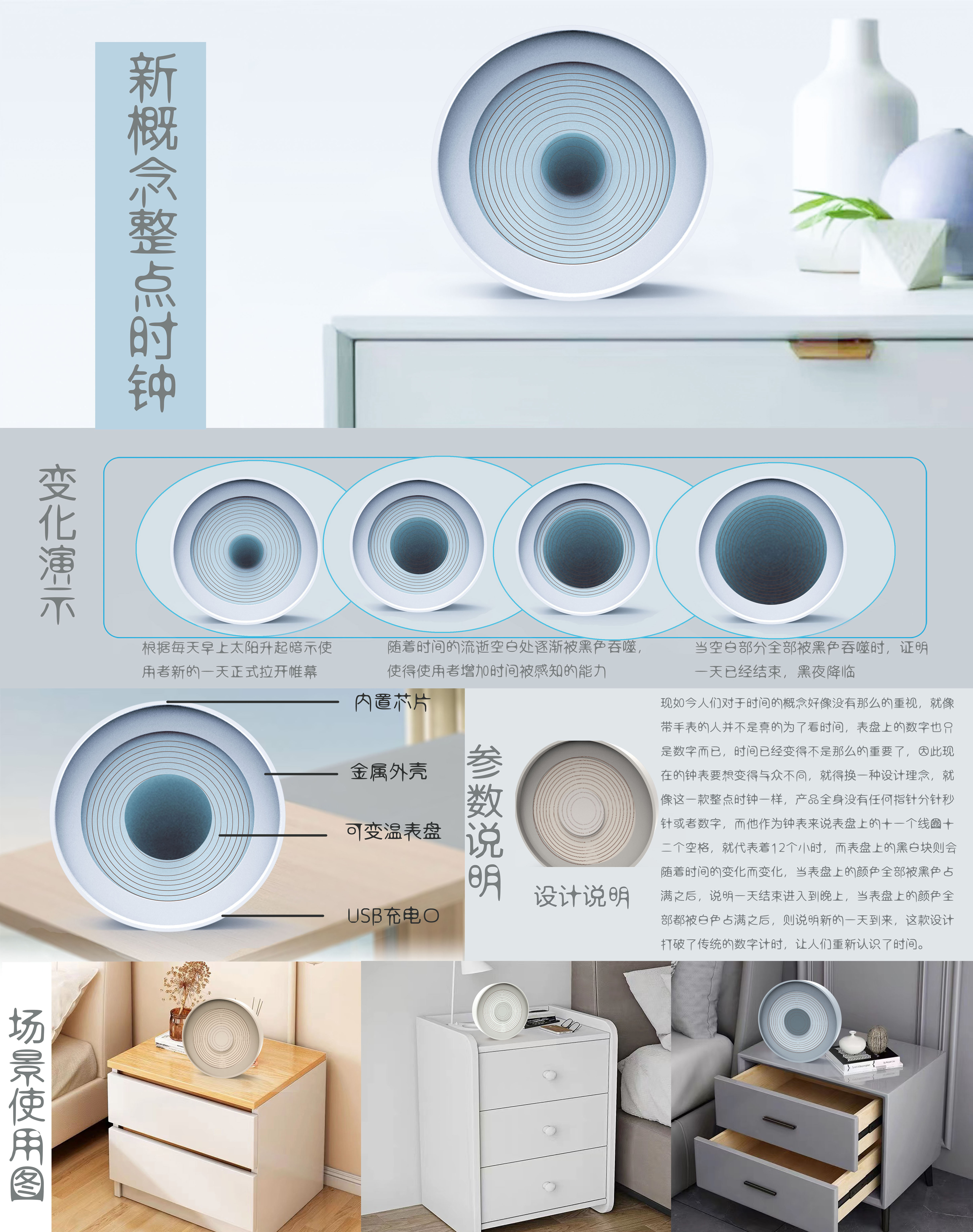 现如今人们对于时间的概念好像没有那么的重视,就像带手表的人并不是真的为了看时间,表盘上的数字也只是数字而已,时间已经变得不是那么的重要了,因此现在的钟表要想变得与众不向,就得换一种设计理念, 上的黑白块则会随着时间的变化而变化,当表盘上的颜色全部被黑色占满之后,说明一天结束进入到晚上,当表盘上的颜色全部都被白色占满之后,则说明新的一天到来,这款设计打破了传统的数字计时,让人们重新认识了时间。