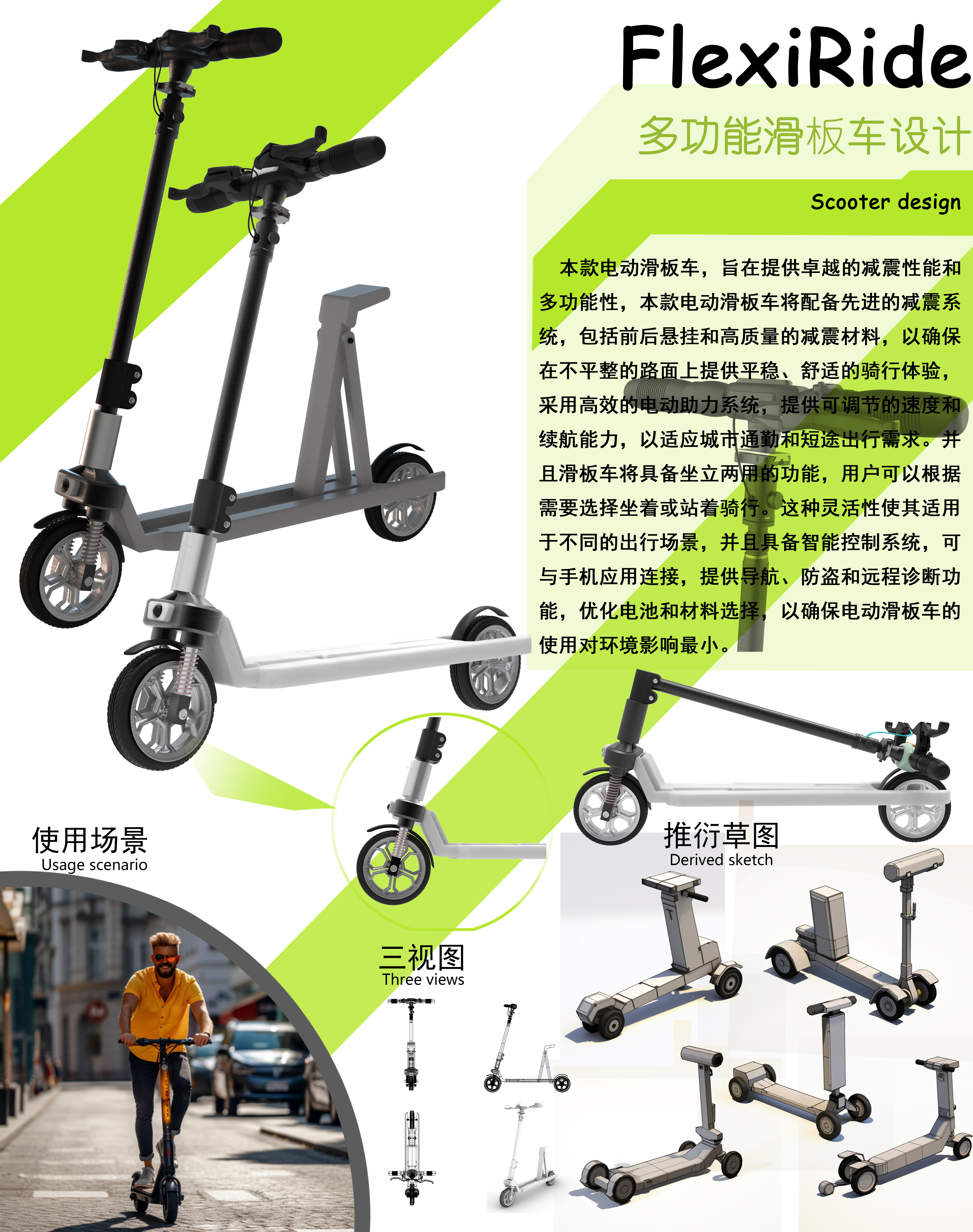 本款电动滑板车,旨在提供卓越的减震性能和多功能性,本款电动滑板车配备先进的减震系统,包括前后悬挂和高质量的减震材料,以确保在不平整的路面上提供舒适的骑行体验,采用高效的电动助力系统,提供可调节的速度和续航能力,以适应城市通勤和短途出行需求。并且滑板车将具备坐立两用的功能,适用于不同的出行场景,并且具备智能控制系统,可与手机应用连接,提供导航、防盗功能,优化电池和材料选择,以确保环境影响最小。