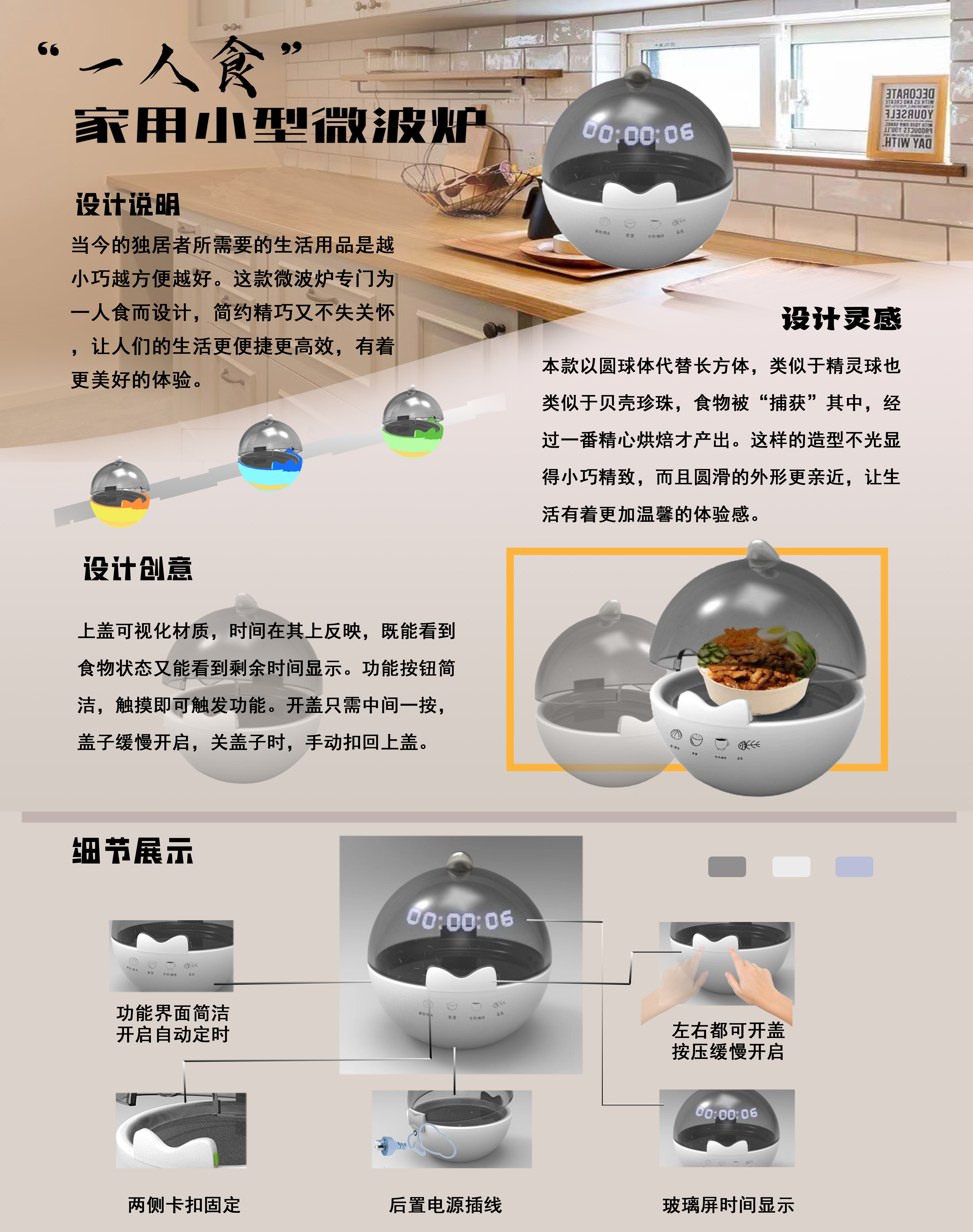 当今的独居者所需要的生活用品是越小巧越方便越好。这款微波炉专门为一人食而设计,简约精巧又不失关怀,让人们的生活更便捷更高效,有着更美好的体验。上盖可视化材质,时间在其上反映,既能看到食物状态又能看到剩余时间显示。功能按钮简洁,触摸即可触发功能。开盖只需中间一按,盖子缓慢开启,关盖子时,手动扣回上盖。
