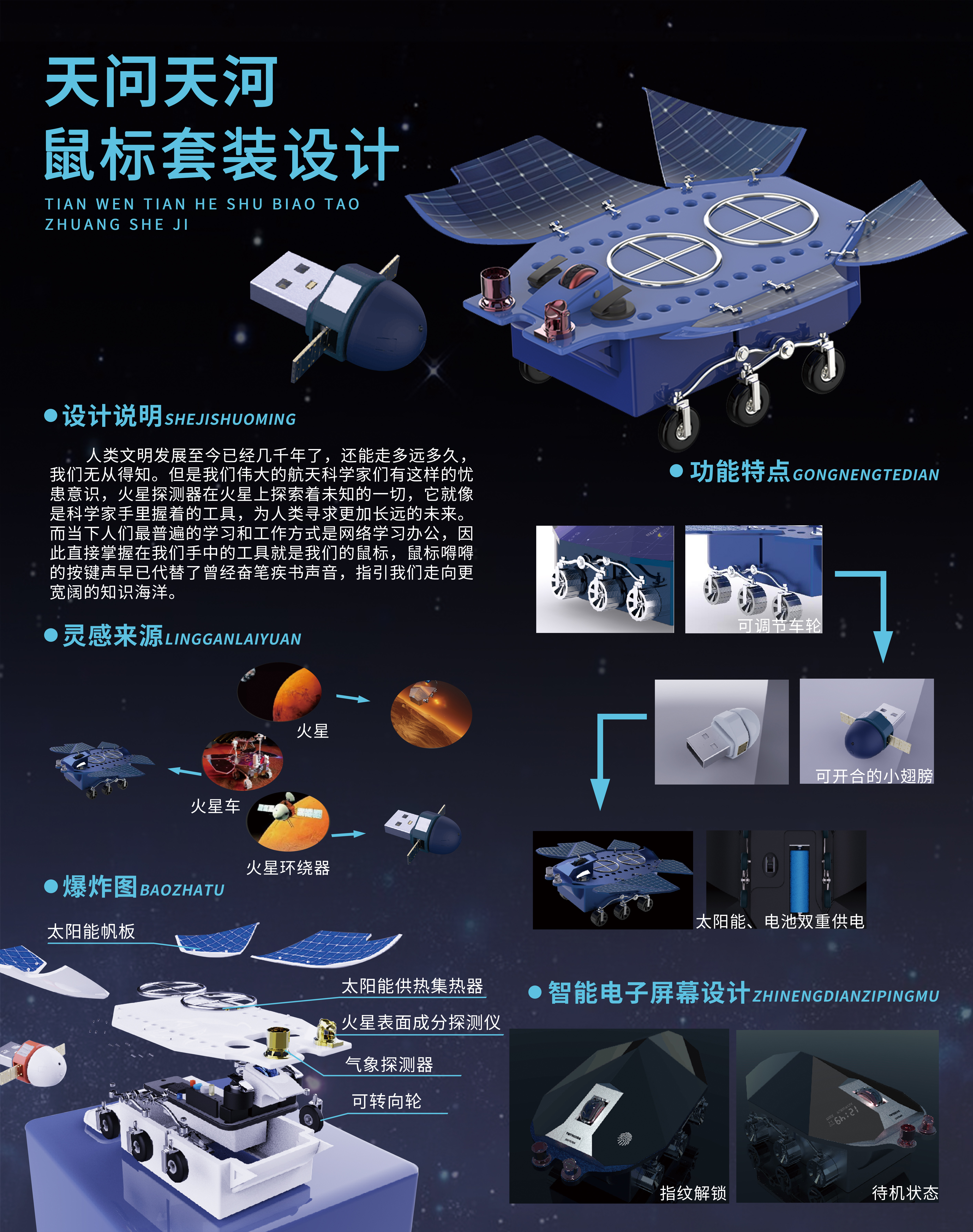 针对我国首次登陆火星表面的天问一号探测器为设计灵感,设计了该款鼠标套装。我们伟大的航天科学家们把无数的大国重器送入太空,火星探测器在火星上探索着未知的一切,它就像是科学家手里握着的工具,为人类寻求更加长远的未来。而当下人们最普遍的学习和工作方式是网络学习办公,因此直接掌握在我们手中的工具就是我们的鼠标,鼠标得得的按键声早已代替了曾经奋笔疾书的声音,指引我们走向更宽阔的知识海洋。