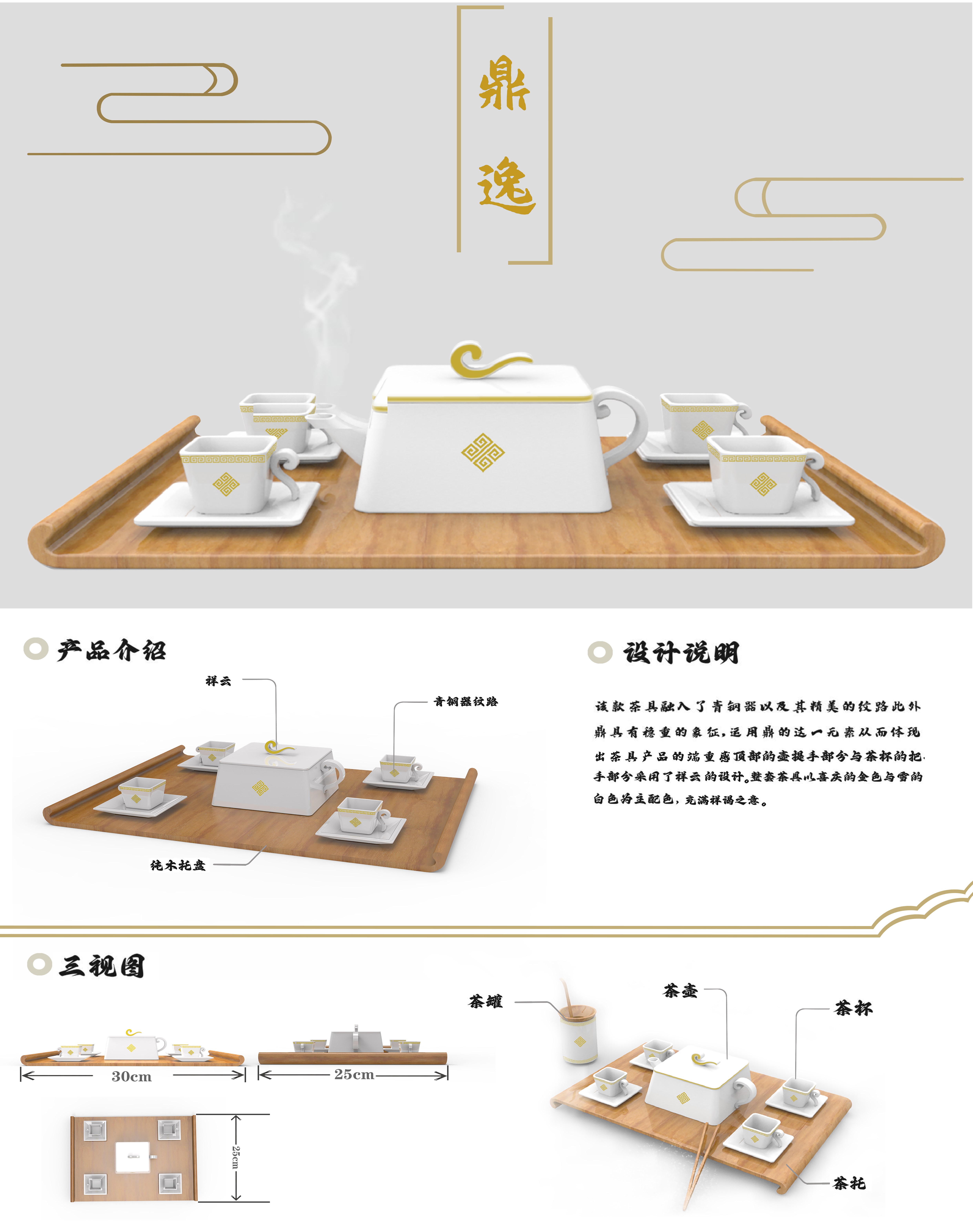 该款茶具融入了青钢器以及其精美的纹路此外鼎具有稳重的象征,运用鼎的达一无素从而体现出 茶具产品的端重 感顶部的查提手部今与茶杯的把手部分采用了样云的设计。整资茶具以喜庆的金色与雪的白色为主配色,充满祥谒之意。