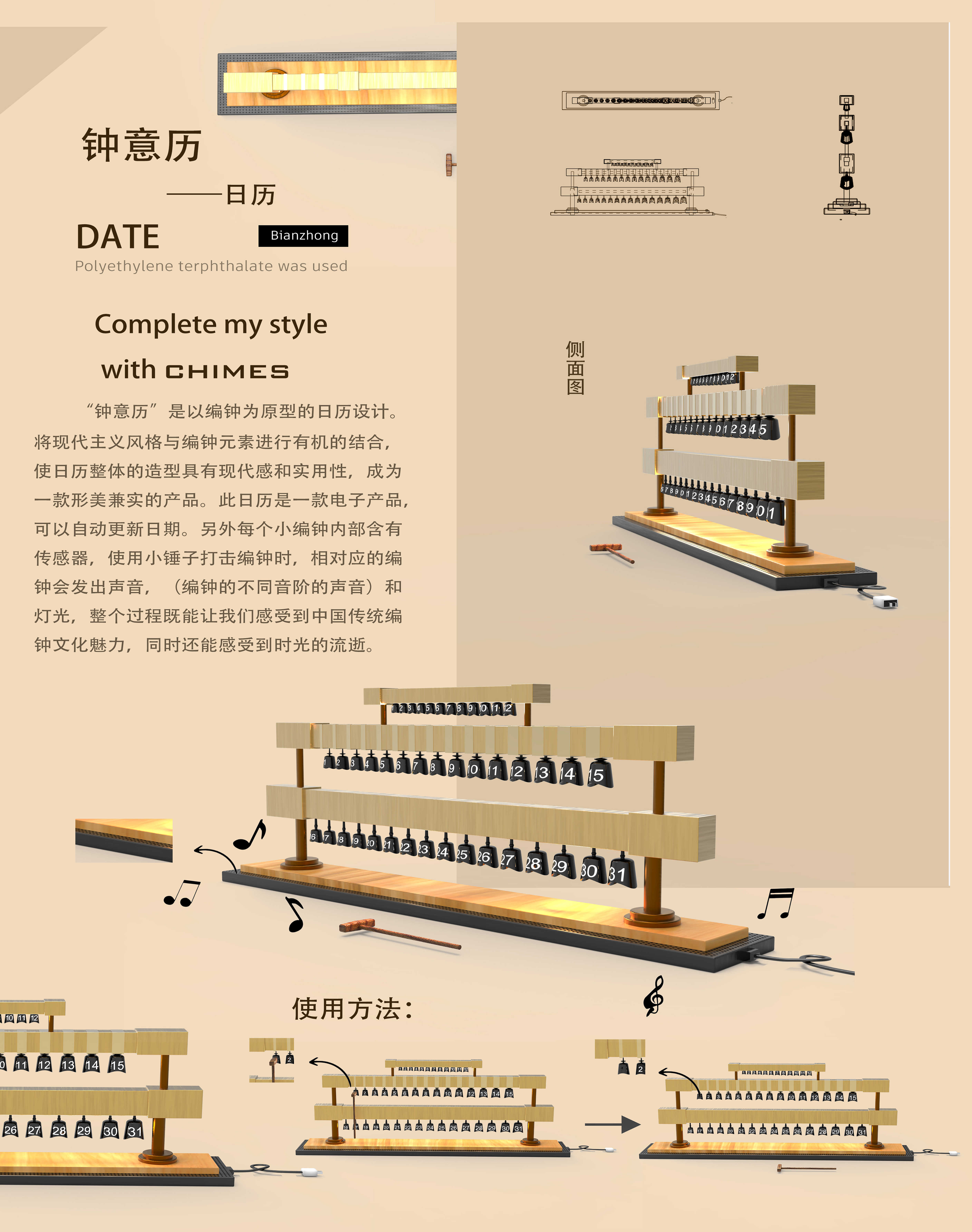 “钟意历”是以编钟为原型的日历设计将现代主义风格与编钟元素进行有机的结合,使日历整体的造型具有现代感和实用性,成为-款形美兼实的产品。此日历是一款电子产品可以自动更新日期。另外每个小编钟内部含有传感器,使用小锤子打击编钟时,相对应的编钟会发出声音,(编钟的不同音阶的声音) 和灯光,整个过程既能让我们感受到中国传统编钟文化魅力,同时还能感受到时光的流逝。