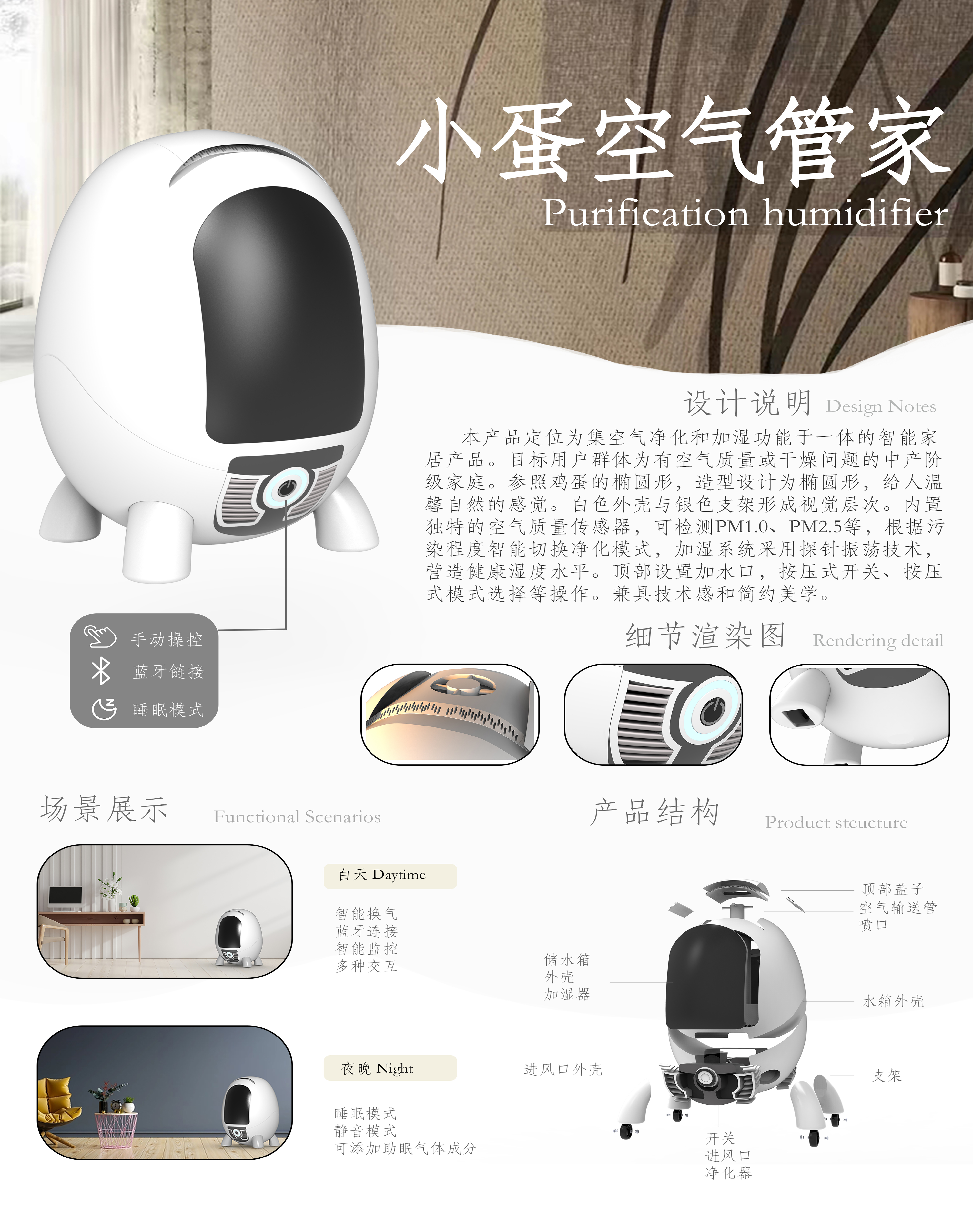本产品定位为集空气净化和加湿功能于一体的智能家居产品。目标用户群体为有空气质量或干燥问题的中产阶级家庭。参照鸡蛋的椭圆形,造型设计为椭圆形,给人温馨自然的感觉。白色外壳与银色支架形成视觉层次。内置独特的空气质量传感器,可检测PM1.0、PM2.5等,根据污染程度智能切换净化模式,加湿系统采用探针振荡技术,营造健康湿度水平。顶部设置加水口,按压式开关、按压式模式选择等操作。