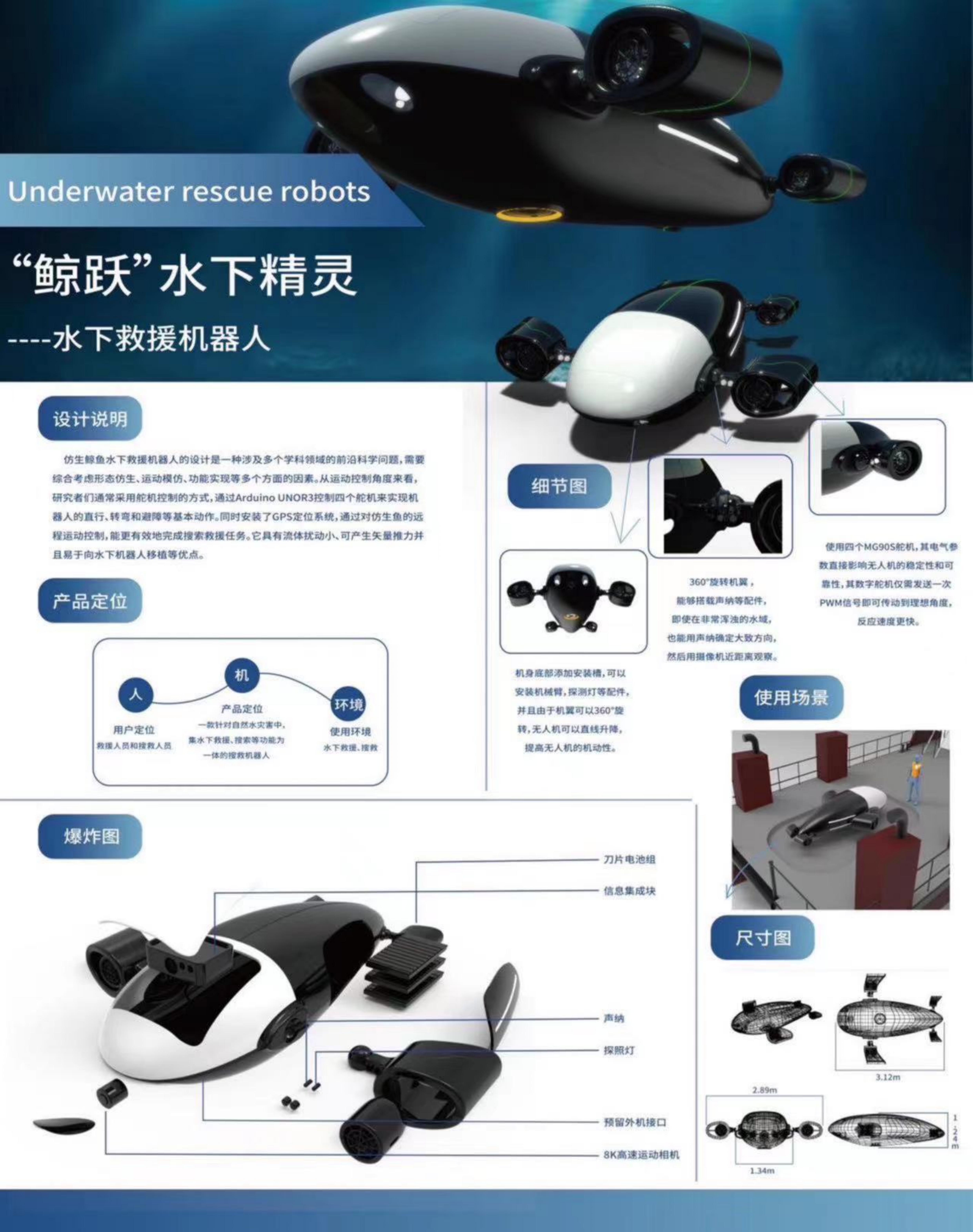 仿生鲸鱼水下救援机器人的设计是一种涉及多个学科领域的前沿科学问题,需要综合考虑形态仿生、运动模仿、功能实现等多个方面的因素。从运动控制角度来看,研究者们通常采用舵机控制的方式,通过Arduino UNOR3控制三个舵机来实现机器人的直行、转弯和避障等基本动作。同时安装了GPS定位系统,通过对仿生鱼的远程控制,能更有效地完成搜索救援任务。且它具有流体扰动小、可产生矢量推力并且易于向水下机器人移植。