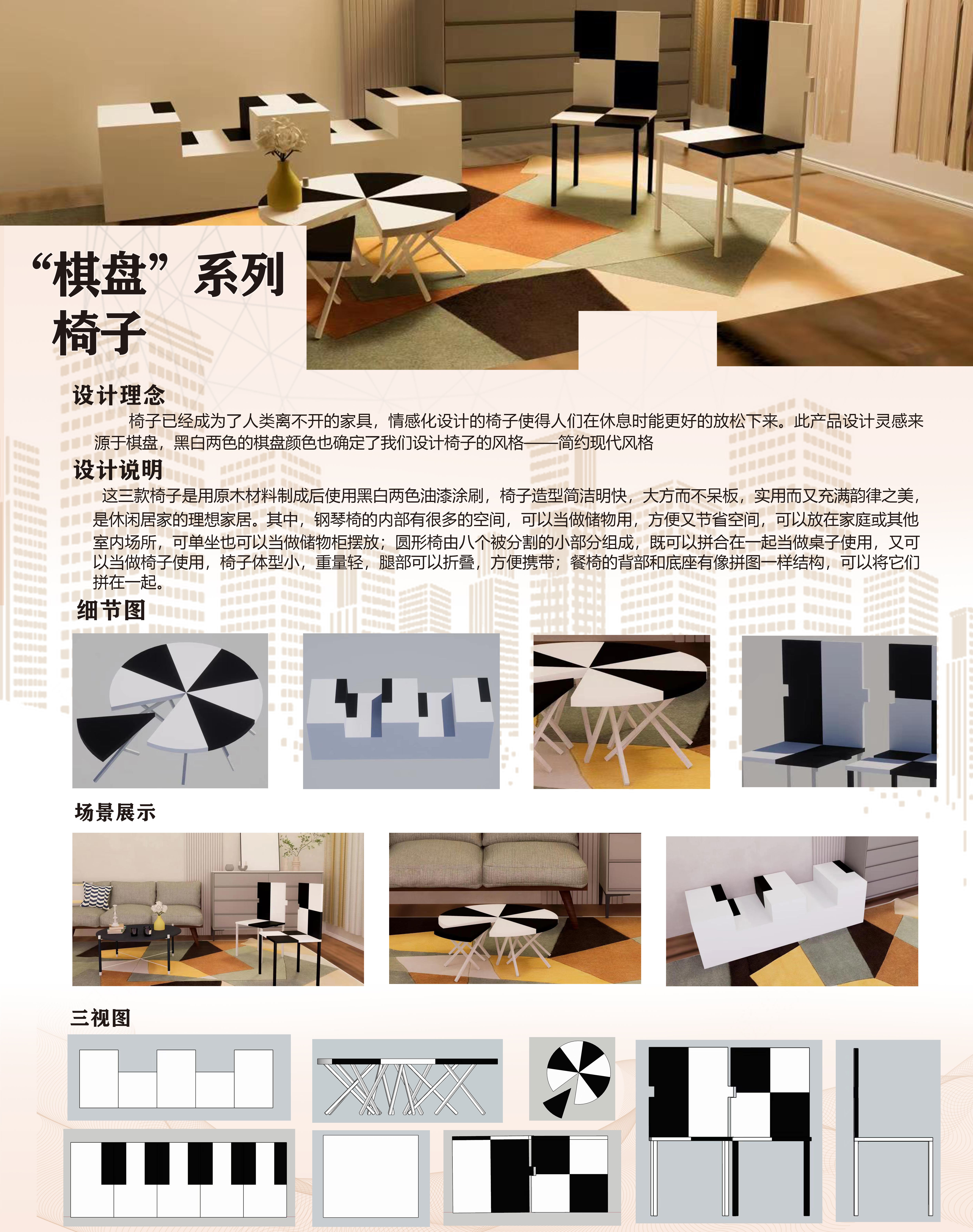 椅子已经成为了人类离不开的家具,这三款椅子采用木质材料制成后使用黑白两色的油漆涂刷,椅子造型简洁明快、大方且不呆板,充满实用美和韵律之美,是居家休闲的理想家具。其中,钢琴椅内部有多余的使用空间,既可以充当椅子也可以充当储物空间;圆形椅由八个小三角形椅组成,既可以当单独椅子使用也可以拼合成一个大的圆形桌子,一椅两用;拼图椅的底部和背部可以像拼图一样拼在一起,组成一张长椅。
