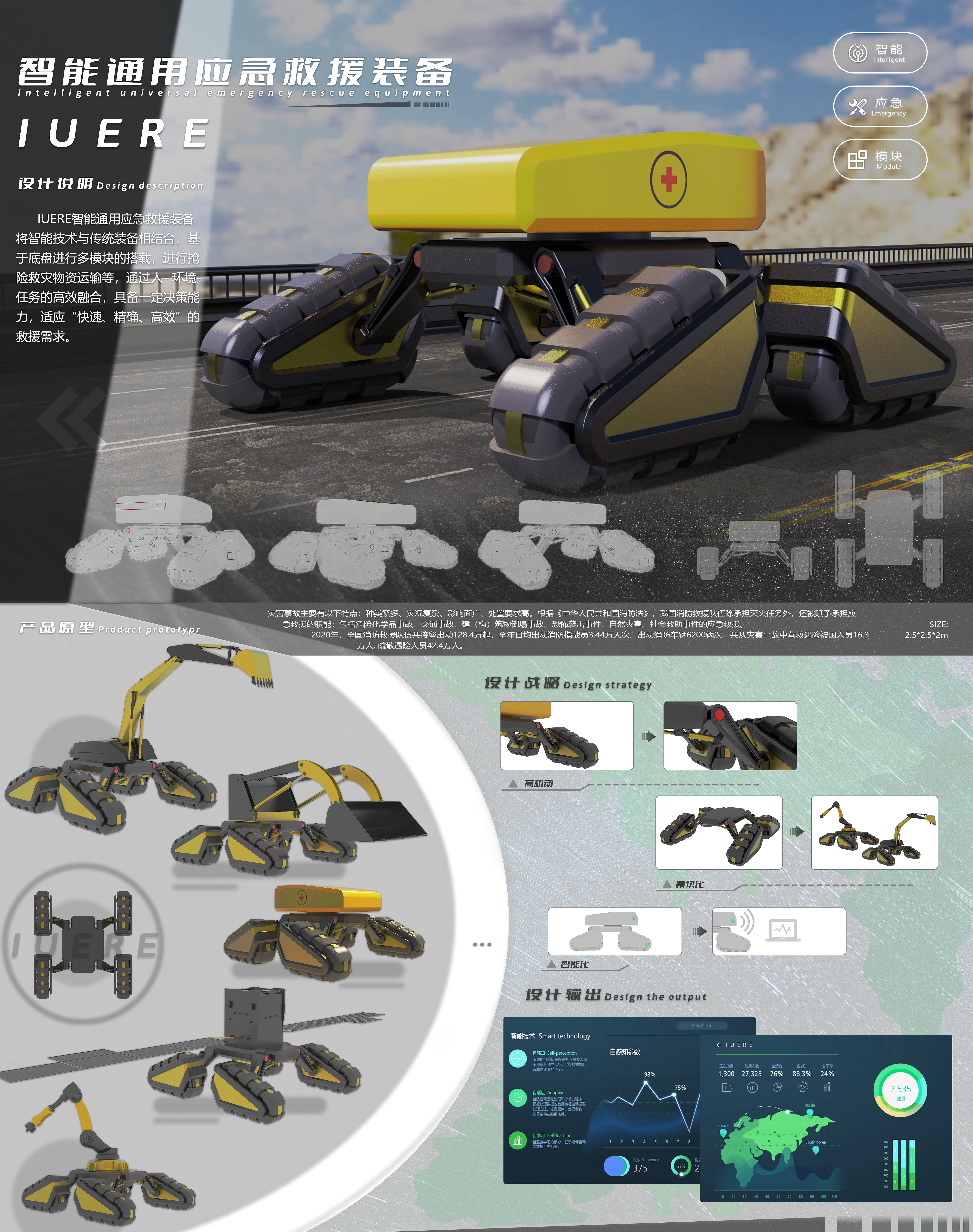 近年来,自然灾害频发。为新时代智能化工业需要,我们设计了智能通用应急救援设备以应对不同行业环境救援需要,一机多用,多功能自动化工业产品。我们将智能技术与传统装备相结合,基于底盘进行多模块的搭载,进行抢险救灾物资运输等,通过人-环境-任务的高效融合,具各一定决策能力,适应“快速、精确、高效”的救援装备
