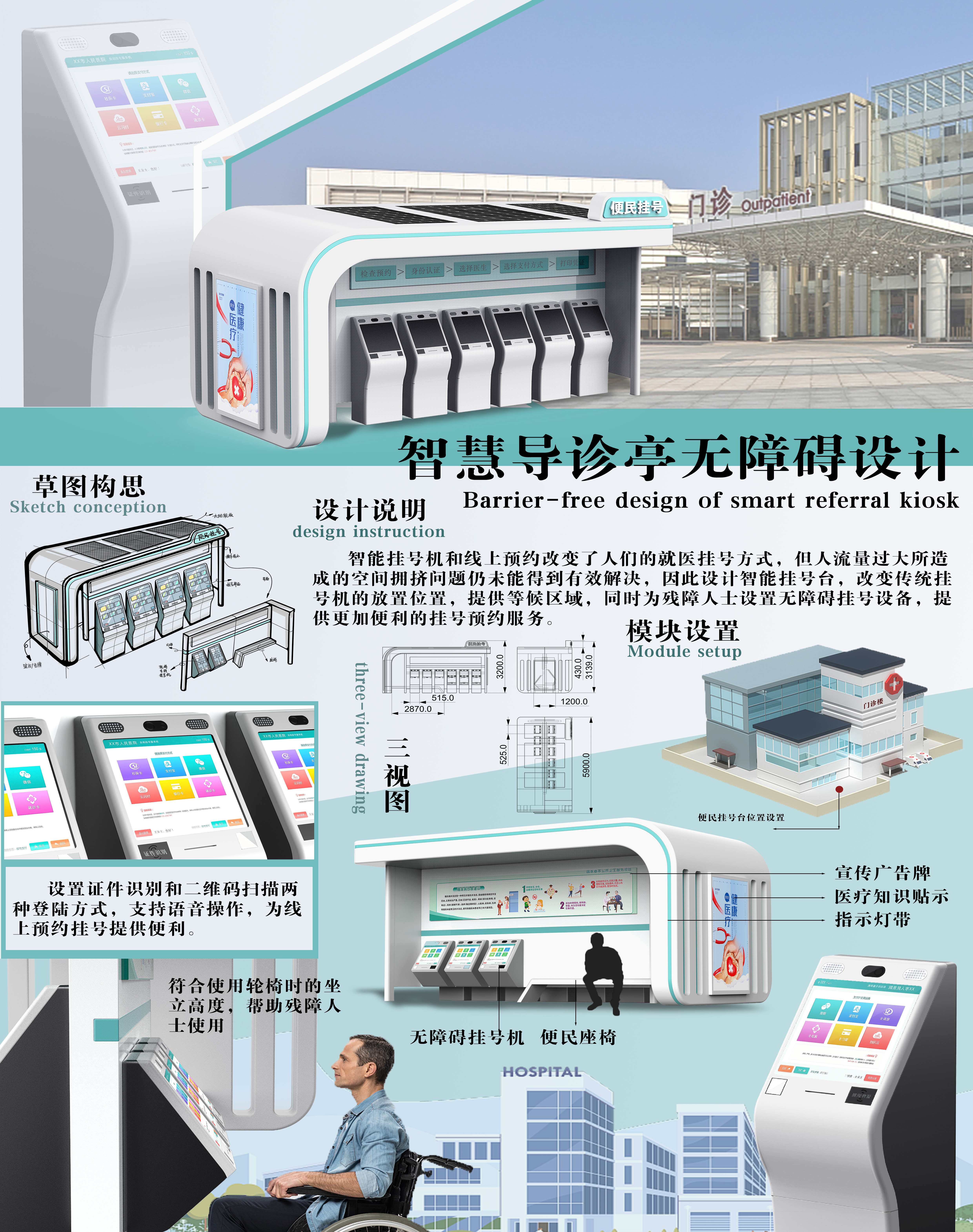 智能挂号机和线上预约改变了人们的就医挂号方式,但人流量过大所造成的空间拥挤问题仍未能得到有效解决,因此设计智能挂号台,改变传统挂 号机的放置位置,提供等候区域,同时为残障人士设置无障碍挂号设备,提供更加便利的挂号预约服务。
