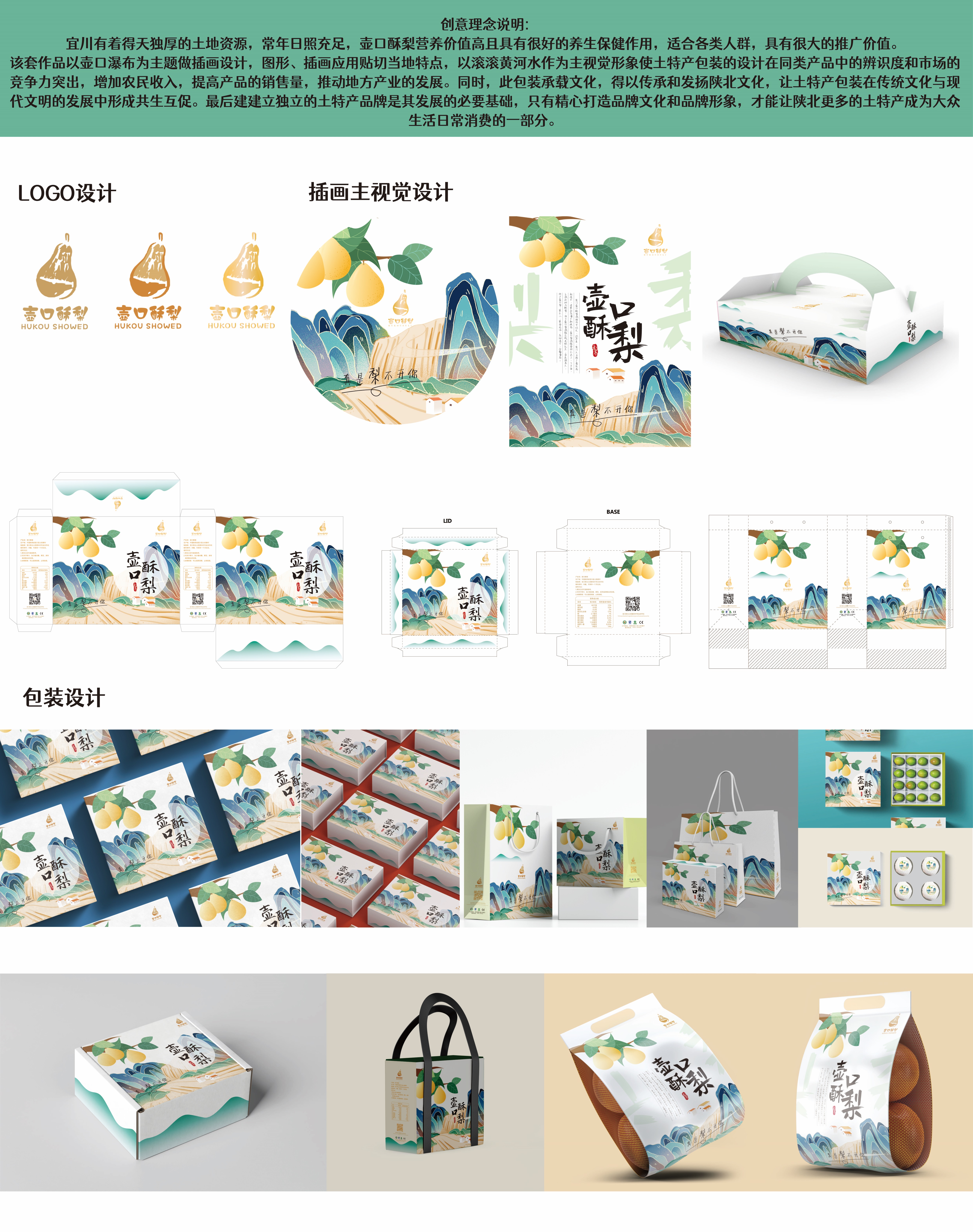 该套作品以壶口瀑布为主题做插画设计,图形、插画应用贴切当地特点,以滚滚黄河水作为主视觉形象使土特产包装的设计增加农民收入,提高产品的销售量,推动地方产业的发展。同时,此包装承载文化,得以传承和发扬陕北文化,让土特产包装在传统文化与现代文明的发展中形成共生互促。建立独立的土特产品牌是发展的必要基础,只有精心打造品牌文化和形象,才能让陕北土特产成为大众生活日常消费的一部分。