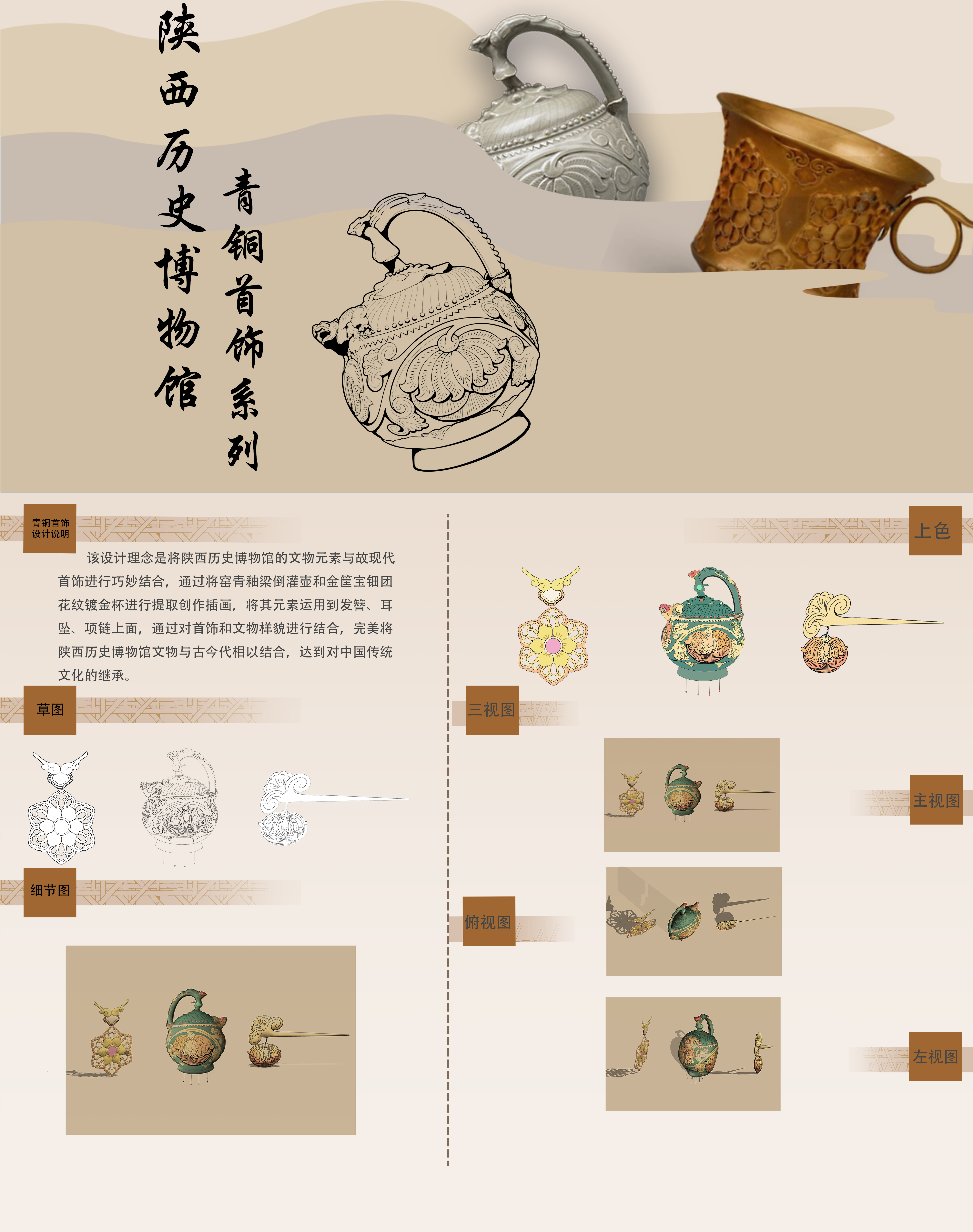 该设计理念是将陕西历史博物馆的文物元素与故现代首饰进行巧妙结合,通过将窑青釉梁倒灌壶和金筐宝钿团花纹镀金杯进行提取创作插画,将其元素运用到发簪、耳坠、项链上面,通过对首饰和文物样貌进行结合,完美将陕西历史博物馆文物与古今代相以结合,达到对中国传统文化的继承