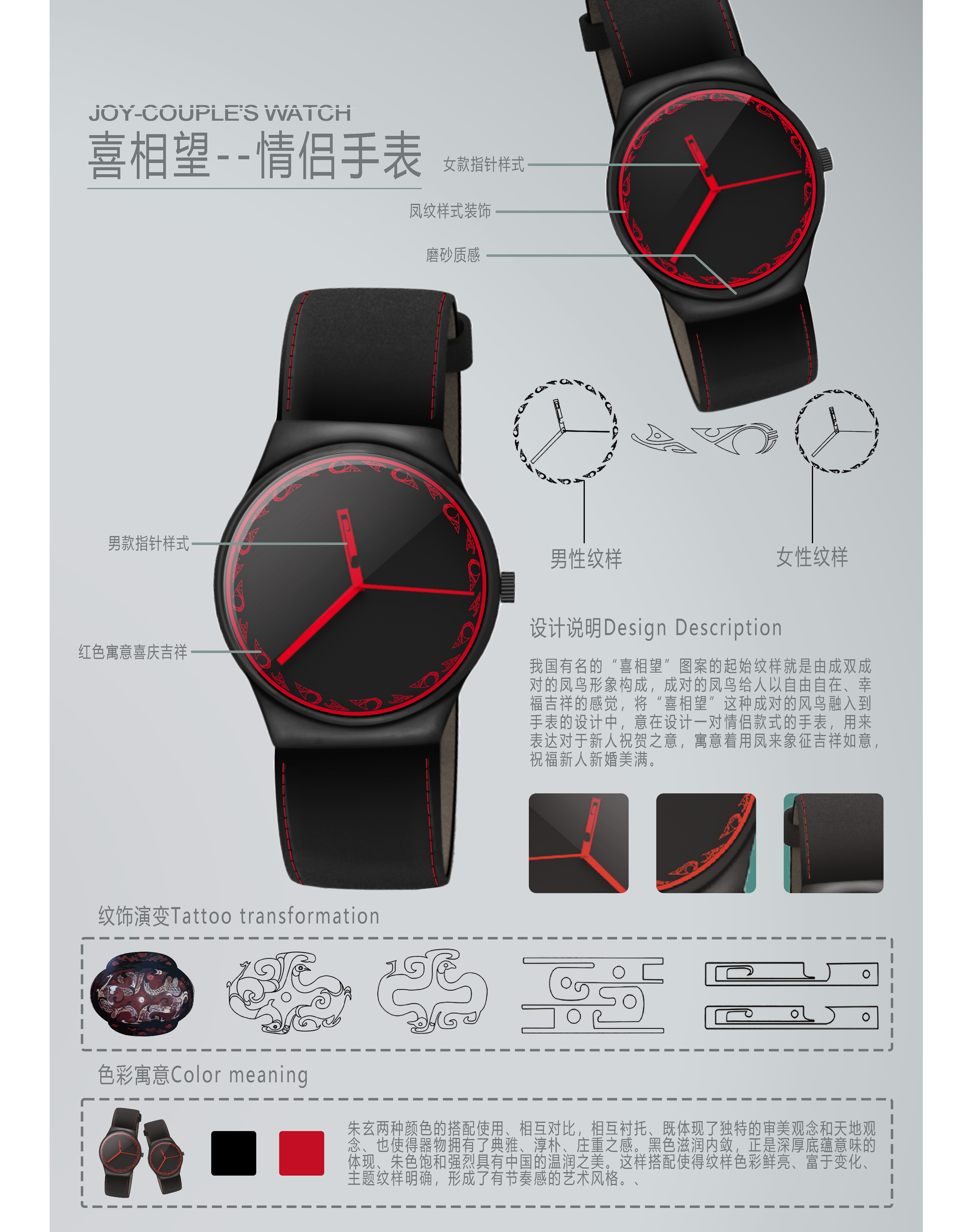 我国有名的“喜相望”图案的起始纹样就是由成双成对的凤鸟形象构成,成对的凤鸟给人以自由自在、幸福吉祥的感觉,将“喜相望”这种成对的风鸟融入到手表的设计中,意在设计一对情侣款式的手表,用来表达对于新人祝贺之意,寓意着用凤来象征吉祥如意,祝福新人新婚美满。