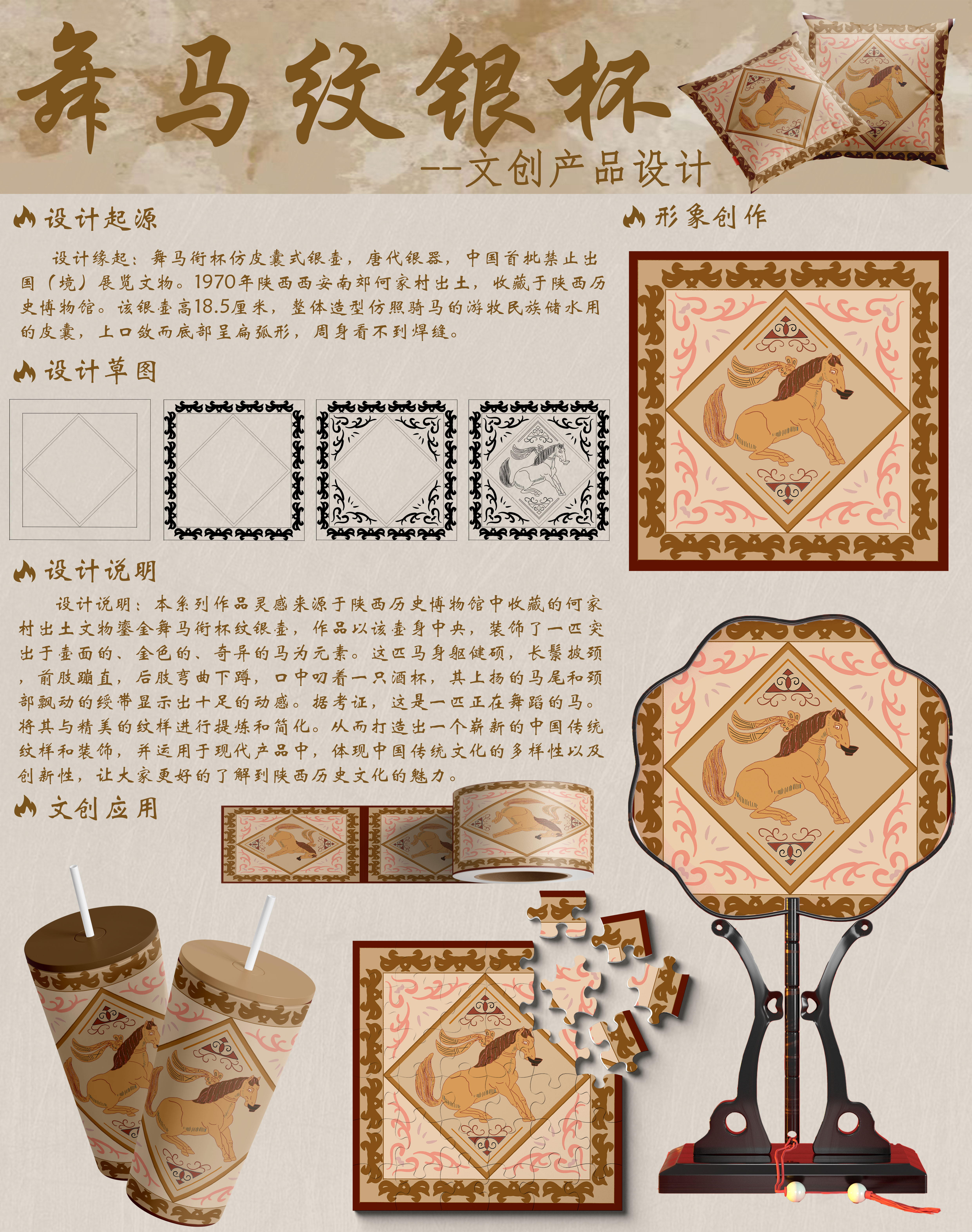 本作品灵感来源于陕西历史博物馆中收藏的何家村出土文物鎏金舞马衔杯纹银壶,作品以该壶身中央,装饰了一匹突出于壶面的、金色的、奇异的马为元素。这匹马身躯健硕,长鬃披颈,前肢蹦直,后肢弯曲下蹲,口中叼着一只酒杯,其上扬的马尾和颈部飘动的绶带显示出十足的动感。从而打造出一个崭新的中国传统纹样和装饰,并运用于现代产品中体现中国传统文化的多样性以及创新性,让大家更好的了解到陕西历史文化的魅力。