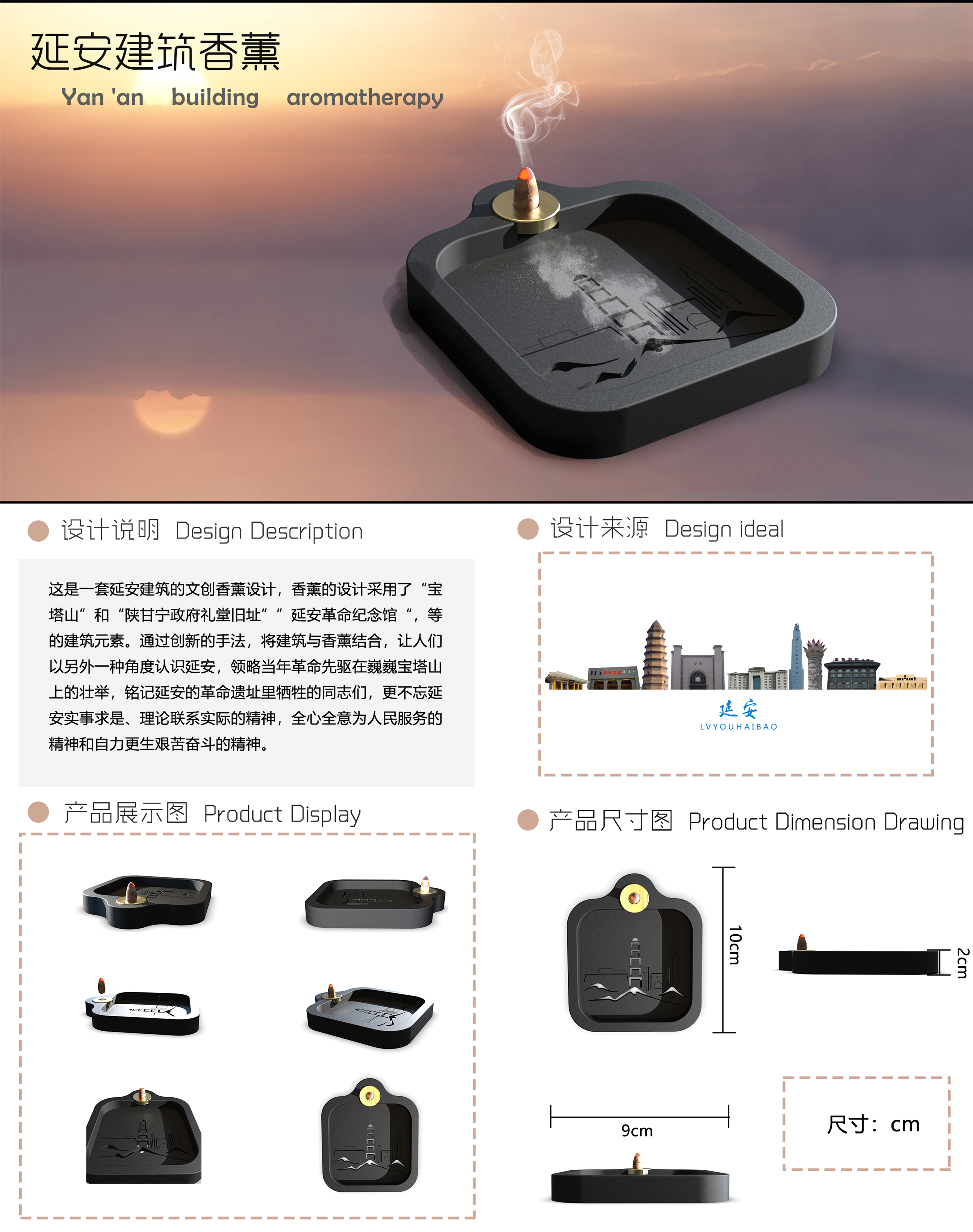 这是一套延安建筑的文创香薰设计,香薰的设计采用了“宝塔山”和“陕甘宁政府礼堂旧址””延安革命纪念馆“,等的建筑元素。通过创新的手法,将建筑与香薰结合,让人们以另外一种角度认识延安,领略当年革命先驱在巍巍宝塔山上的壮举,铭记延安的革命遗址里牺牲的同志们,更不忘延安实事求是、理论联系实际的精神,全心全意为人民服务的精神和自力更生艰苦奋斗的精神。