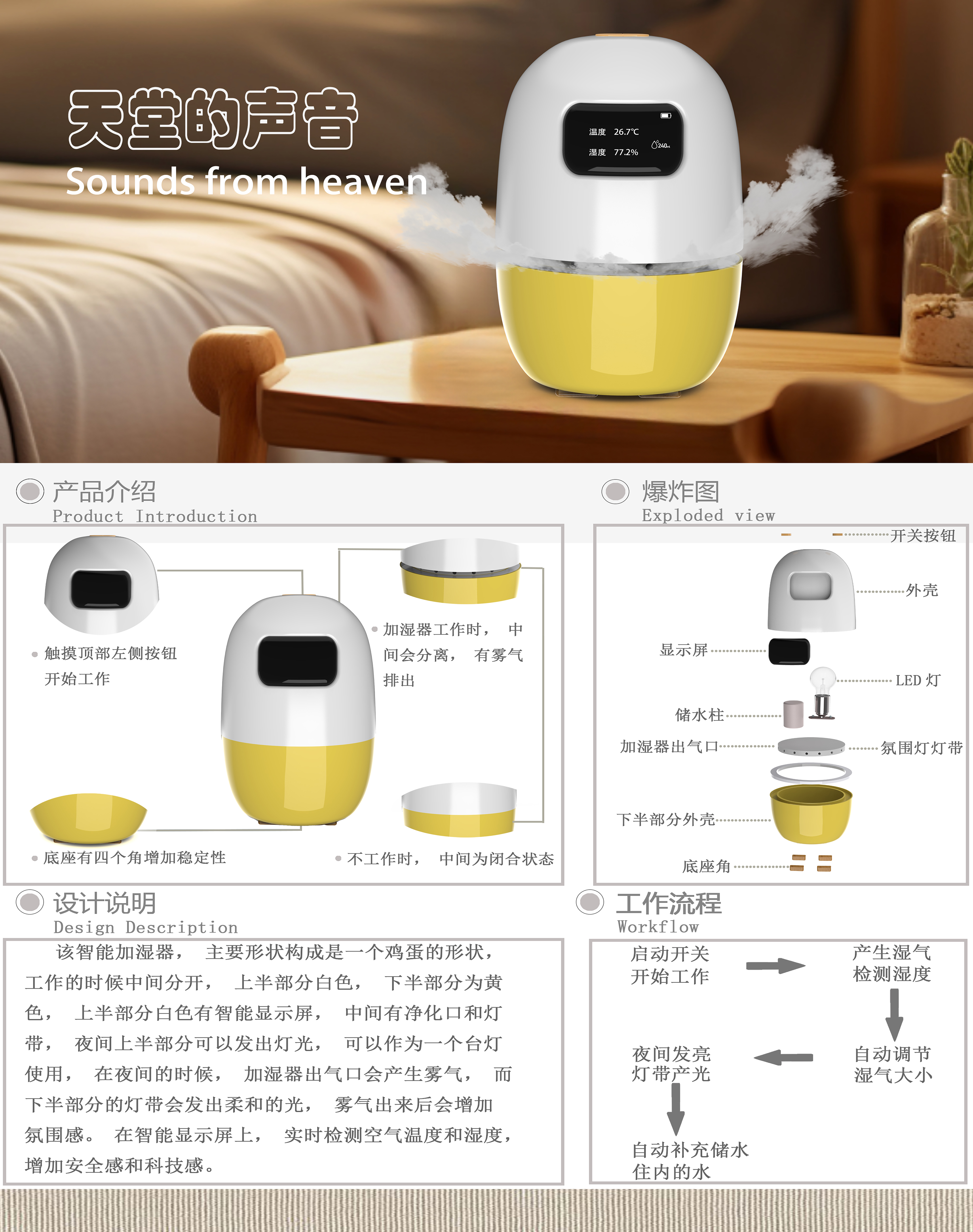 该智能加湿器,主要形状构成是一个鸡蛋的形状,工作的时候中间分开,上半部分白色,下半部分为黄色,上半部分白色有智能显示屏,中间有净化口和灯带,夜间上半部分可以发出灯光,可以作为一个台灯使用,在夜间的时候,加湿器出气口会产生雾气,而下半部分的灯带会发出柔和的光,雾气出来后会增加氛围感。在智能显示屏上,实时检测空气温度和湿度,增加安全感和科技感。
