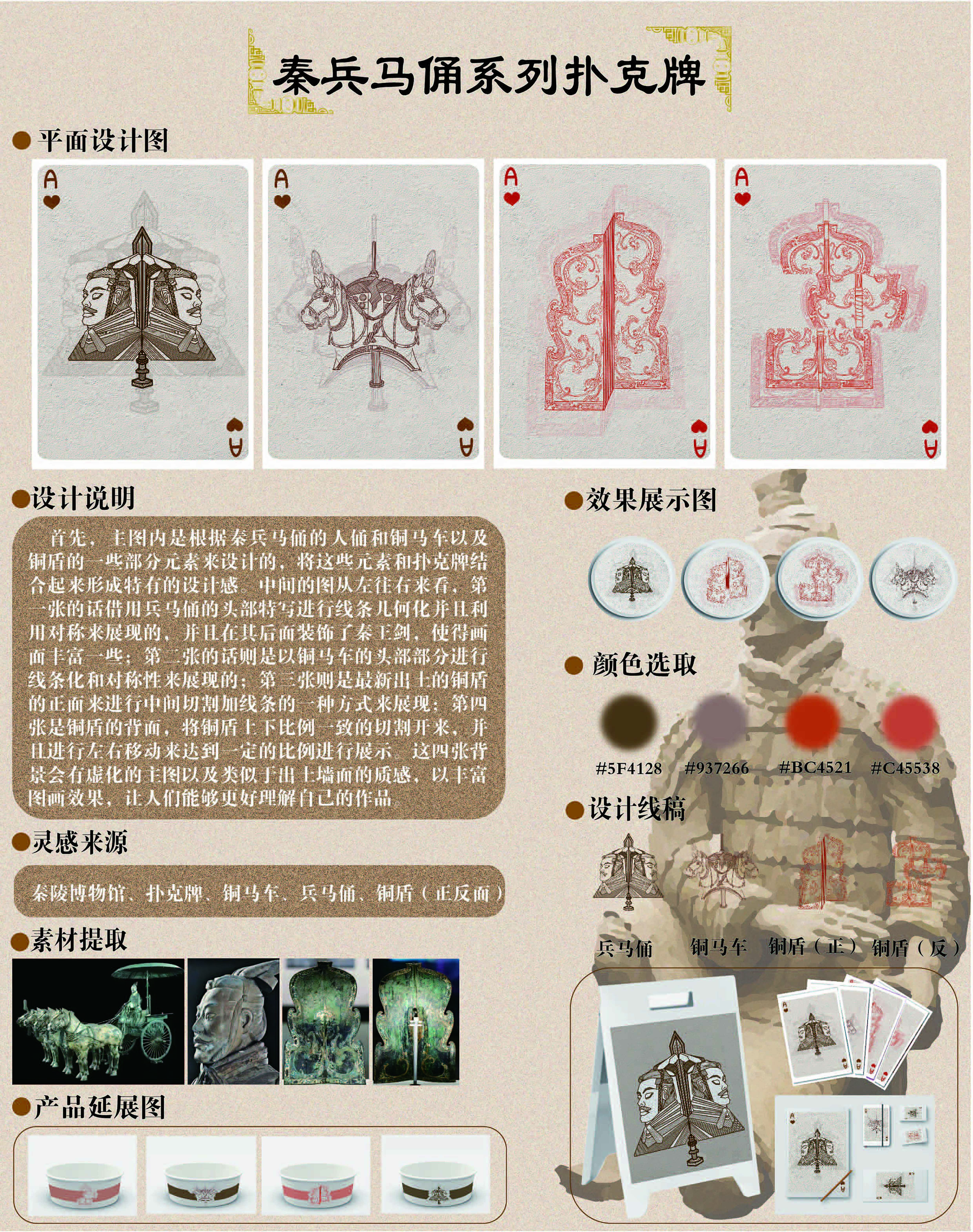 主图是根据秦兵马俑的人俑和铜马车以及铜盾的部分元素来设计的,将这些元素和扑克牌结合起来形成特有的设计感。这四张背景会有虚化的主图以及类似于出土墙面的质感,以丰富图画效果,让人们能够更好理解自己的作品。