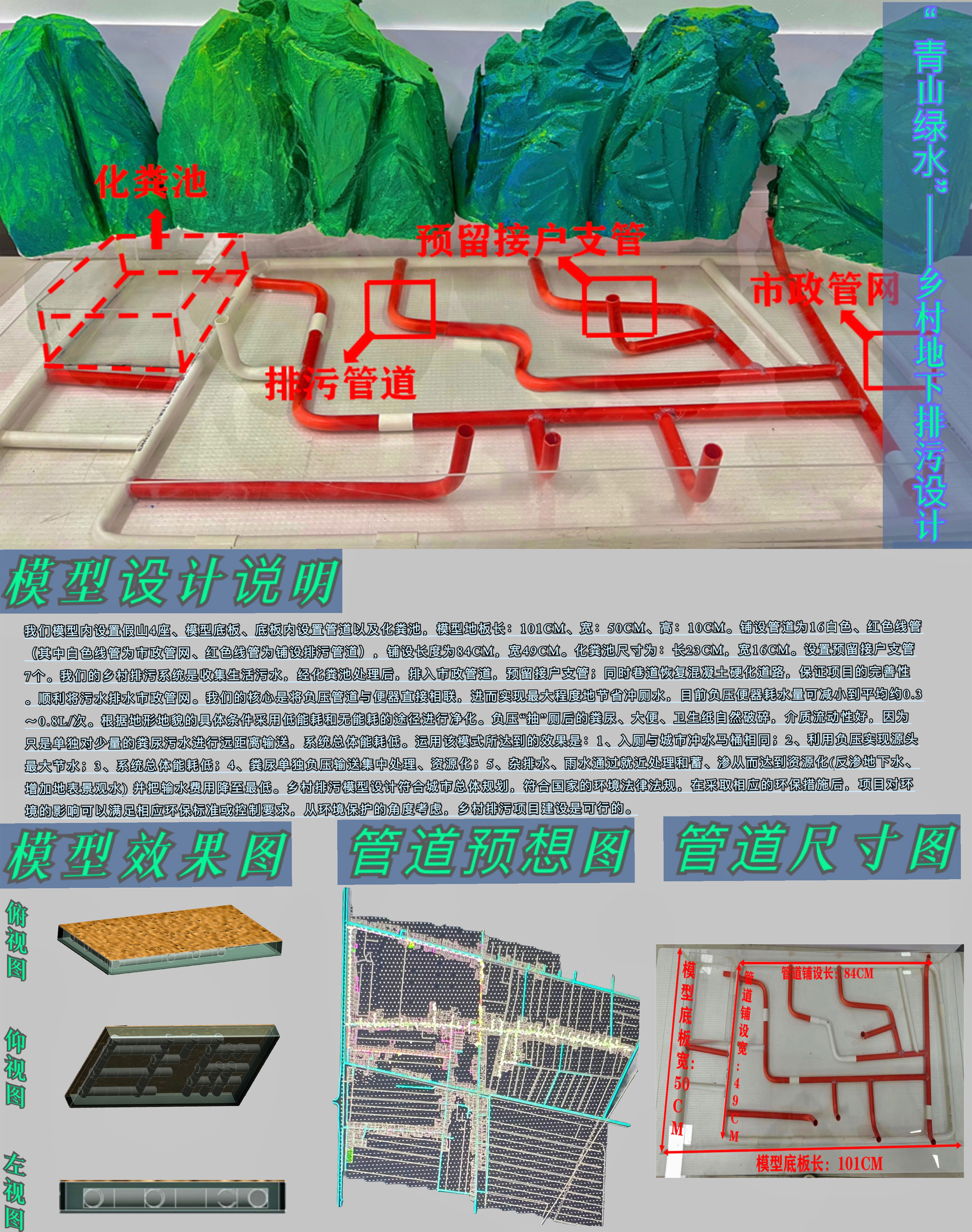 在2021,我国发布了《关于全国推进乡村振兴加快农业农村现代化的意见》等重要文件。我们的模型尺寸为:模型长:101CM、宽:50CM、高:10CM。铺设管道为16白色、红色线管(其中白色线管为市政管网、红色线管为排污管道),铺设长度为84CM,宽49CM。化粪池尺寸:长23CM,宽16CM。预留接户支管7个。由该系统收集生活污水,经化粪池处理后,排入市政管道,预留接户支管,顺利将污水排向市政管网。