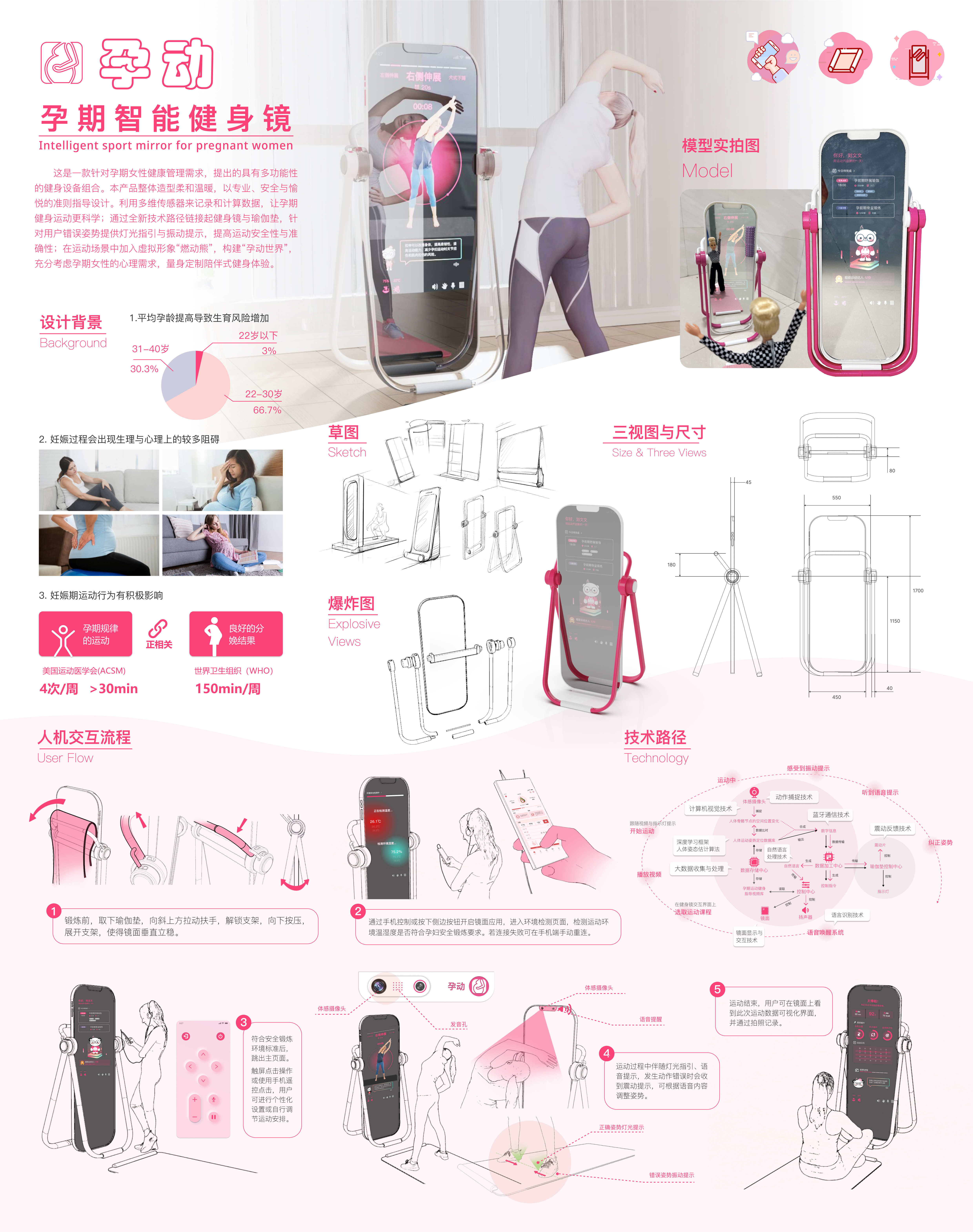 这是一款针对孕期女性健康管理需求,提出的具有多功能性的健身设备组合。本产品整体造型柔和温暖,以专业、安全与愉悦的准则指导设计。利用多维传感器来记录和计算数据,让孕期健身运动更科学;通过全新技术路径链接起健身镜与瑜伽垫,针对用户错误姿势提供灯光指引与振动提示,提高运动安全性与准确性;在运动场景中加入虚拟形象“燃动熊”,构建“孕动世界”,充分考虑孕期女性的心理需求,量身定制陪伴式健身体验。