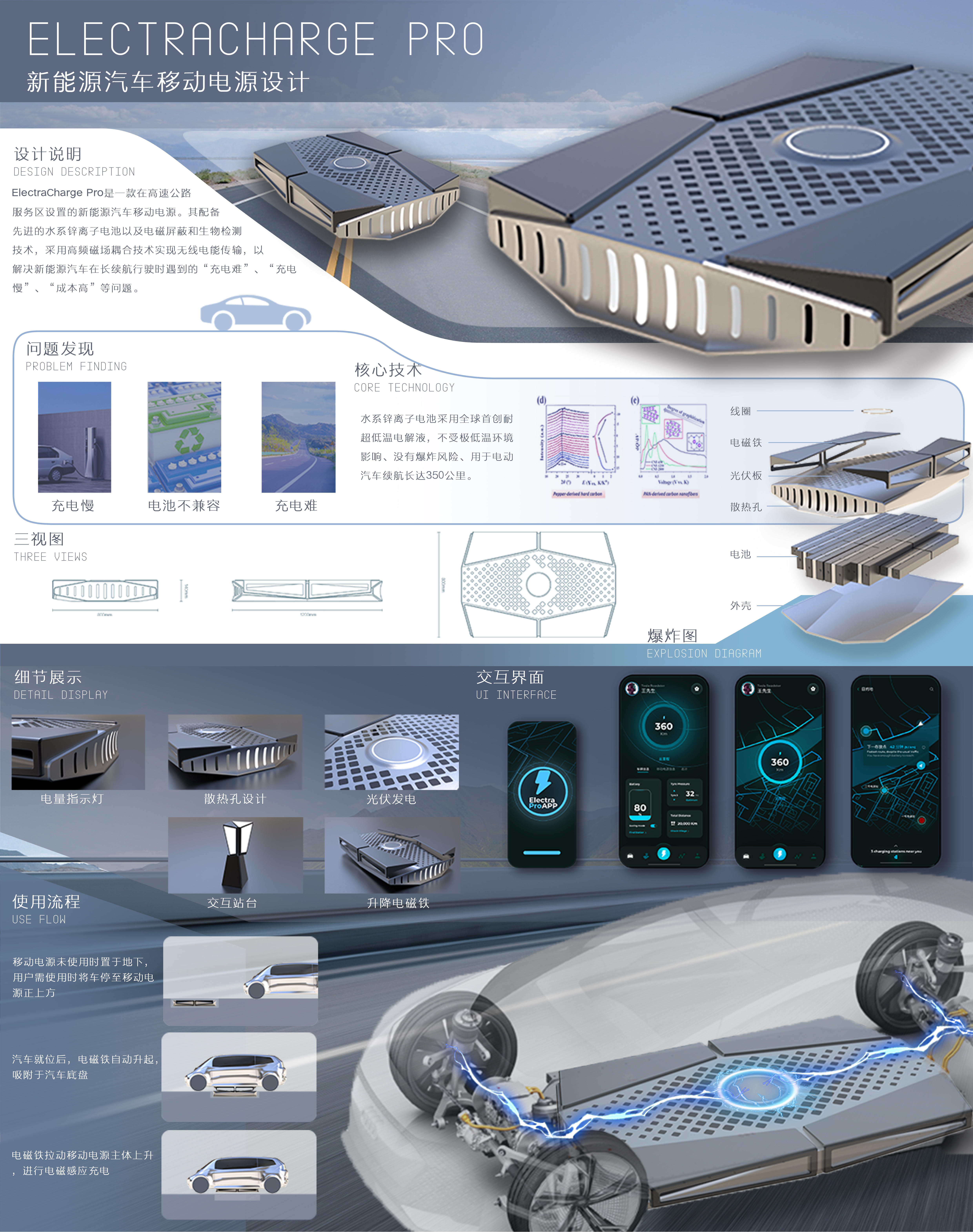 ElectraCharge Pro是一款在高速公路服务区设置的新能源汽车移动电源。 其配备先进的水系锌离子电池以及电磁屏蔽和生物检测技术, 采用高频磁场耦合技术实现无线电能传输, 以解决新能源汽车在长续航行驶时遇到的“充电难”、“充电慢”、“成本高”等问题。