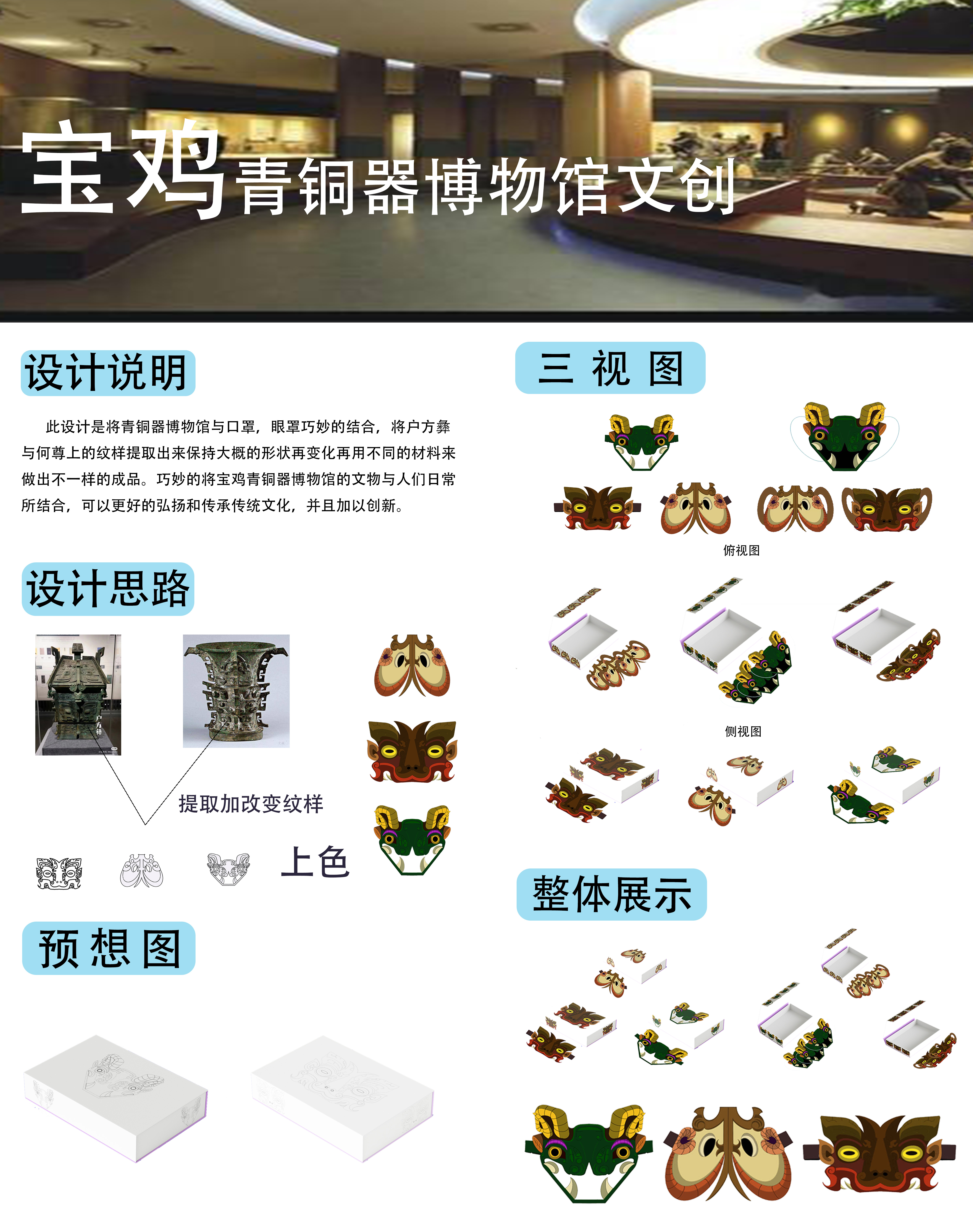 此设计是将青铜器博物馆与口罩,眼罩巧妙的结合,将户方彝与何尊上的纹样提取出来保持大概的形状再变化再用不同的材料来做出不一样的成品。巧妙的将宝鸡青铜器博物馆的文物与人们日常所结合,可以更好的弘扬和传承传统文化,并且加以创新。