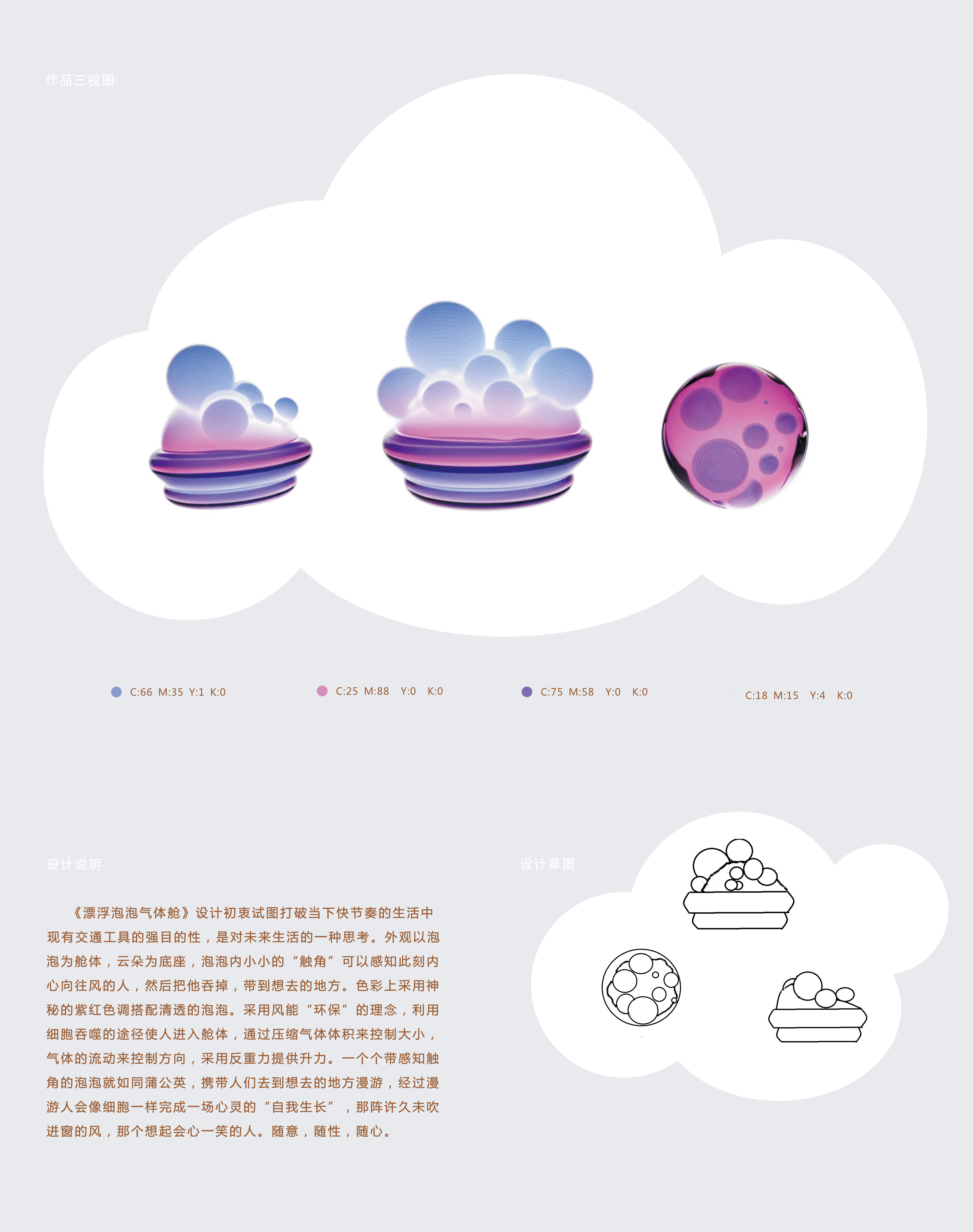 《漂浮泡泡气体舱》设计初衷试图打破当下快节奏的生活中现有交通工具的强目的性,是对未来生活的一种思考。外观以泡泡为舱体,云朵为底座,泡泡内小小的“触角”可以感知此刻内心向往风的人,然后把他吞掉,带到想去的地方。色彩上采用神秘的紫红色调搭配清透的泡泡。采用风能“环保”的理念,利用细胞吞噬的途径使人进入舱体,通过压缩气体体积来控制大小,气体的流动来控制方向,采用反重力提供升力。