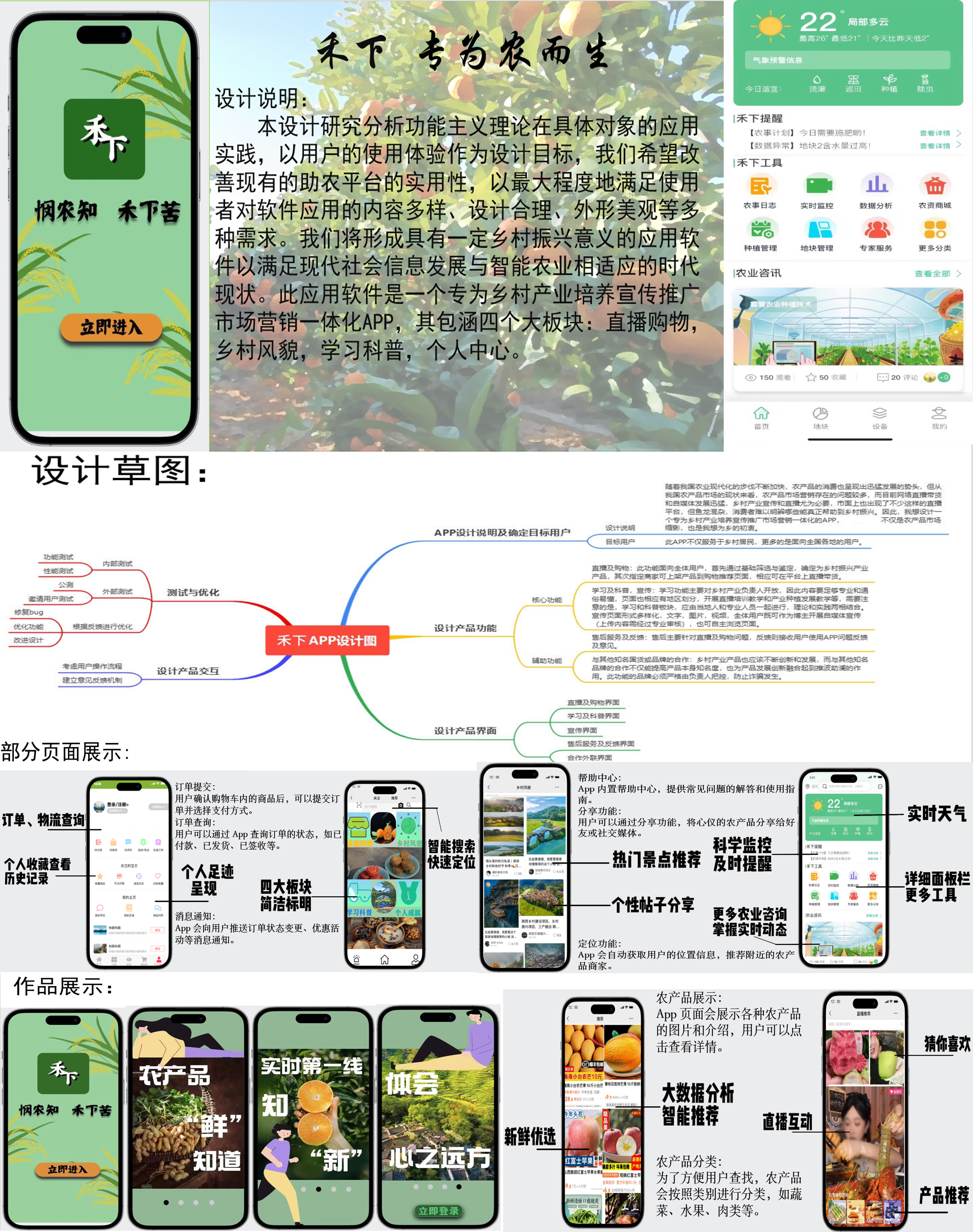 本设计研究分析功能主义理论在具体对象的应用实践,以用户的使用体验作为设计目标,我们希望改善现有的助农平台的实用性,以最大程度地满足使用者对软件应用的内容多样、设计合理、外形美观等多种需求。我们将形成具有一定乡村振兴意义的应用软件以满足现代社会信息发展与智能农业相适应的时代现状。这是一个专为乡村产业培养宣传推广市场营销一体化APP,其包涵四个大板块:直播购物,乡村风貌,学习科普,个人中心。