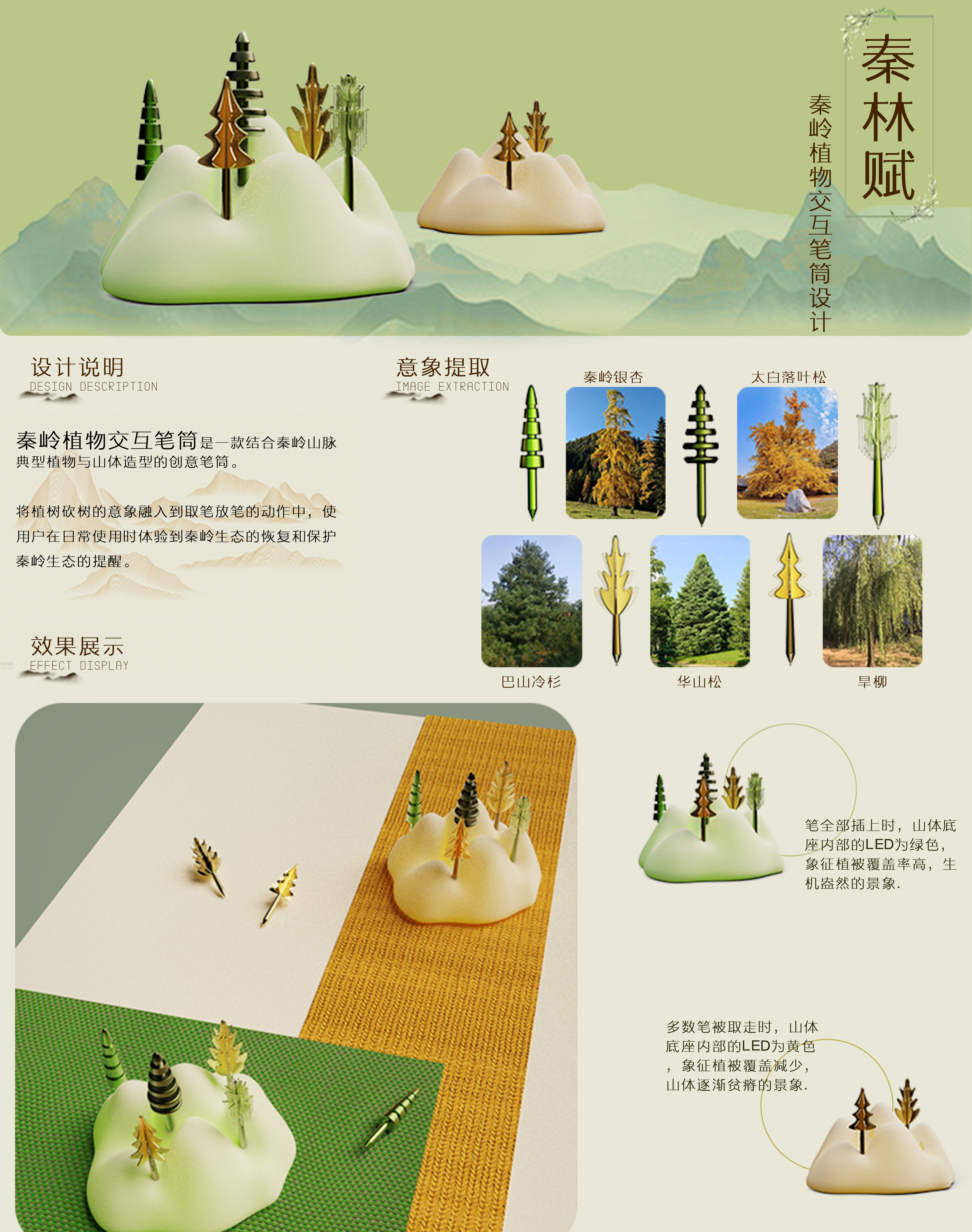 秦岭植物交互笔筒是一款结合秦岭山脉典型植物与山体造型的创意笔筒。 将植树砍树的意象融入到取笔放笔的动作中,使用户在日常使用时体验到秦岭生态的恢复和保护秦岭生态的提醒。
