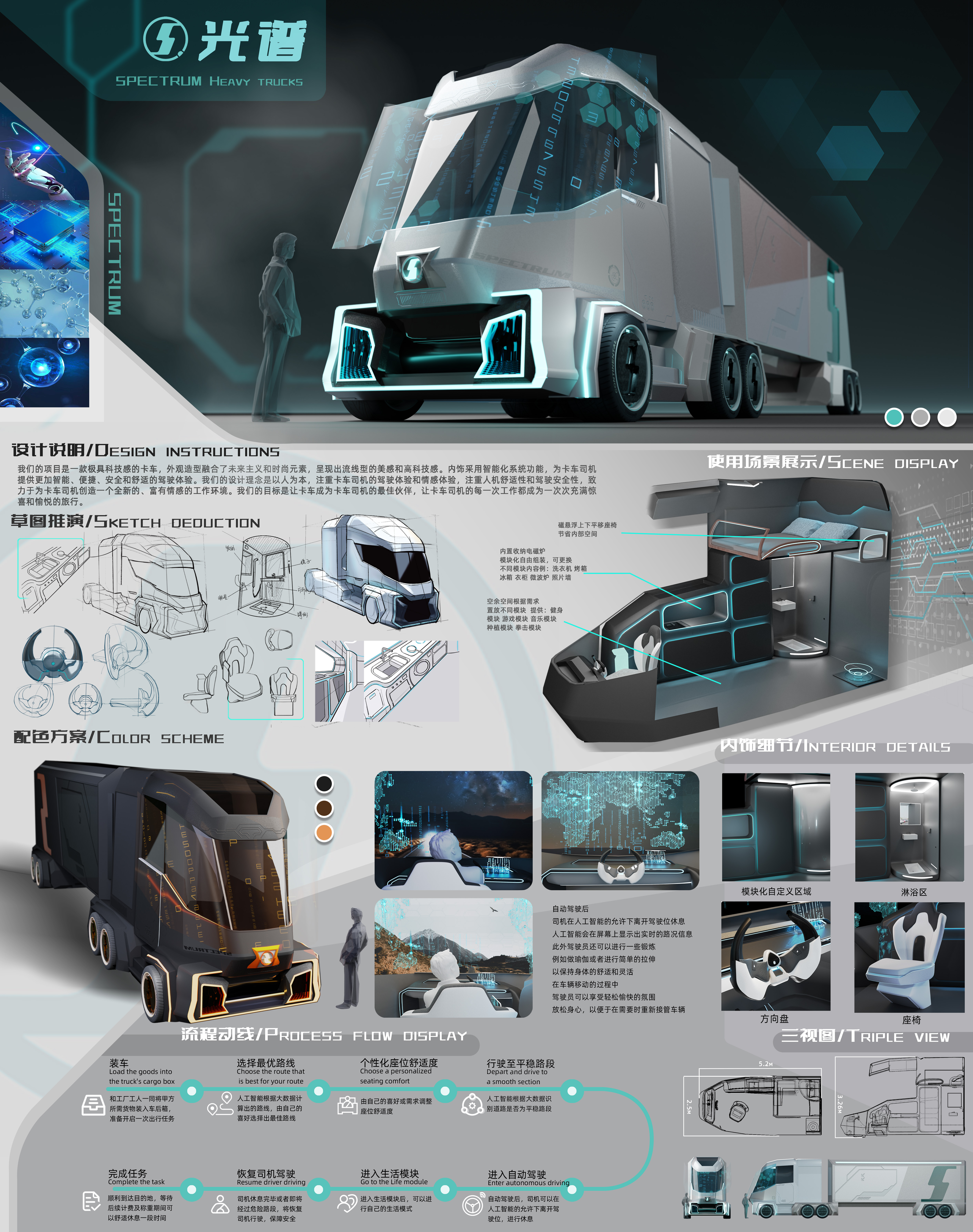 我们的项目是一款极具科技感的卡车,型融合了未来主义元素,呈现出流线型的美感和高科技感。内饰采用智能化系统功能,为卡车司机提供更加智能、便捷、安全和舒适的驾驶体验。我们的设计理念是以人为本,注重卡车司机的驾驶体验和情感体验,注重人机舒适性和驾驶安全性,致力于为卡车司机创造一个全新的、富有情感的工作环境。我们的目标是让卡车成为卡车司机的最佳伙伴,让卡车司机的每一次工作都成为一次次充满惊喜和愉悦的旅行
