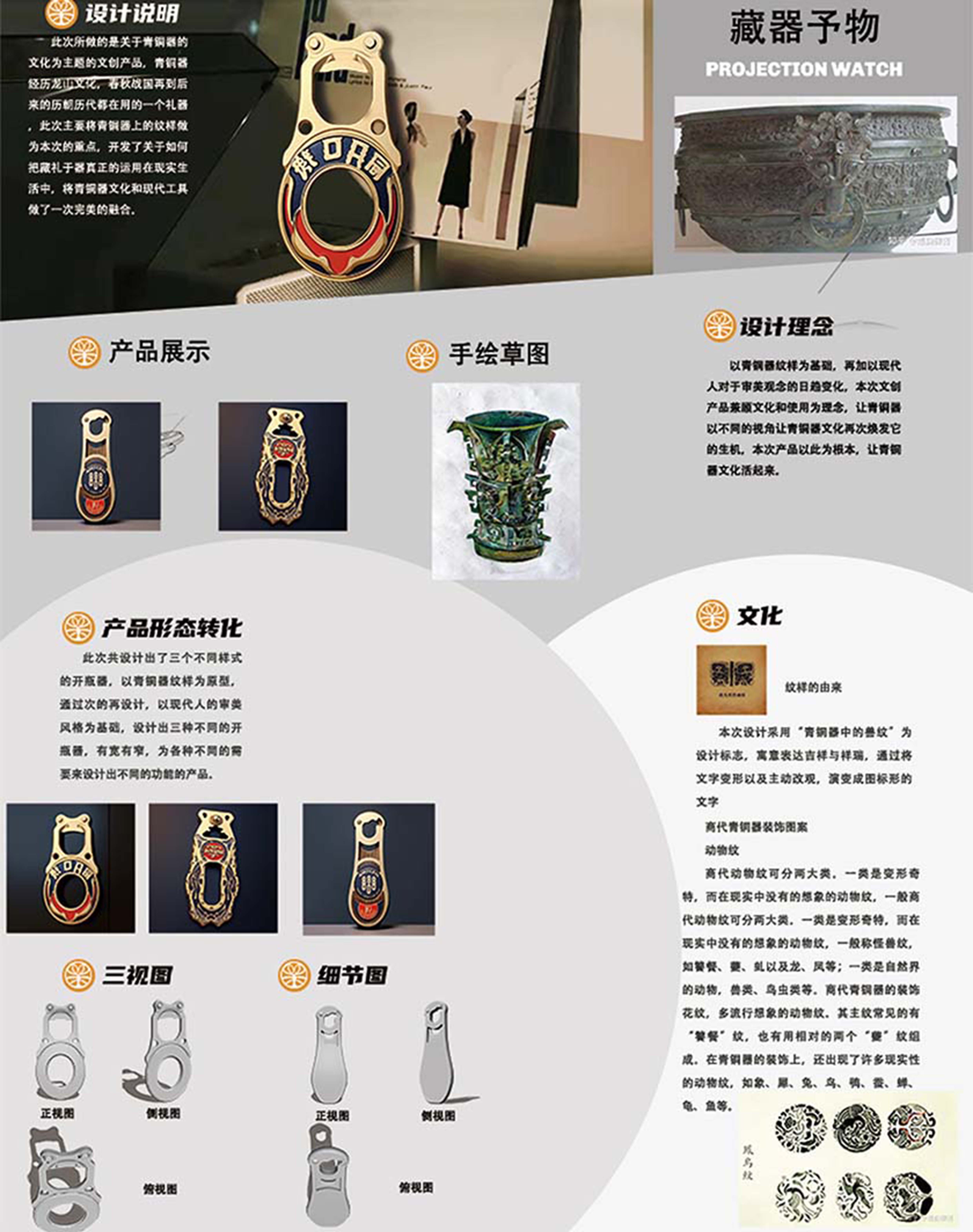 此次所做的产品是有关于青铜器文化为主题的文创产品设计中国青铜器发展为三大阶段,即形成期、鼎盛时期和转变期。成时期为龙山文化时代,距今4800~4000年即公元前2800-2000年之间,本次文创产品设计是依据青铜器上的纹样作为本次文创产品的重点,本次设计不但注重文创本身文化的塑造,而是文化与日常生活的实用性相关,让青铜器文化与现代工具做的一次融合,让青铜器,和青铜文化活起来!!!