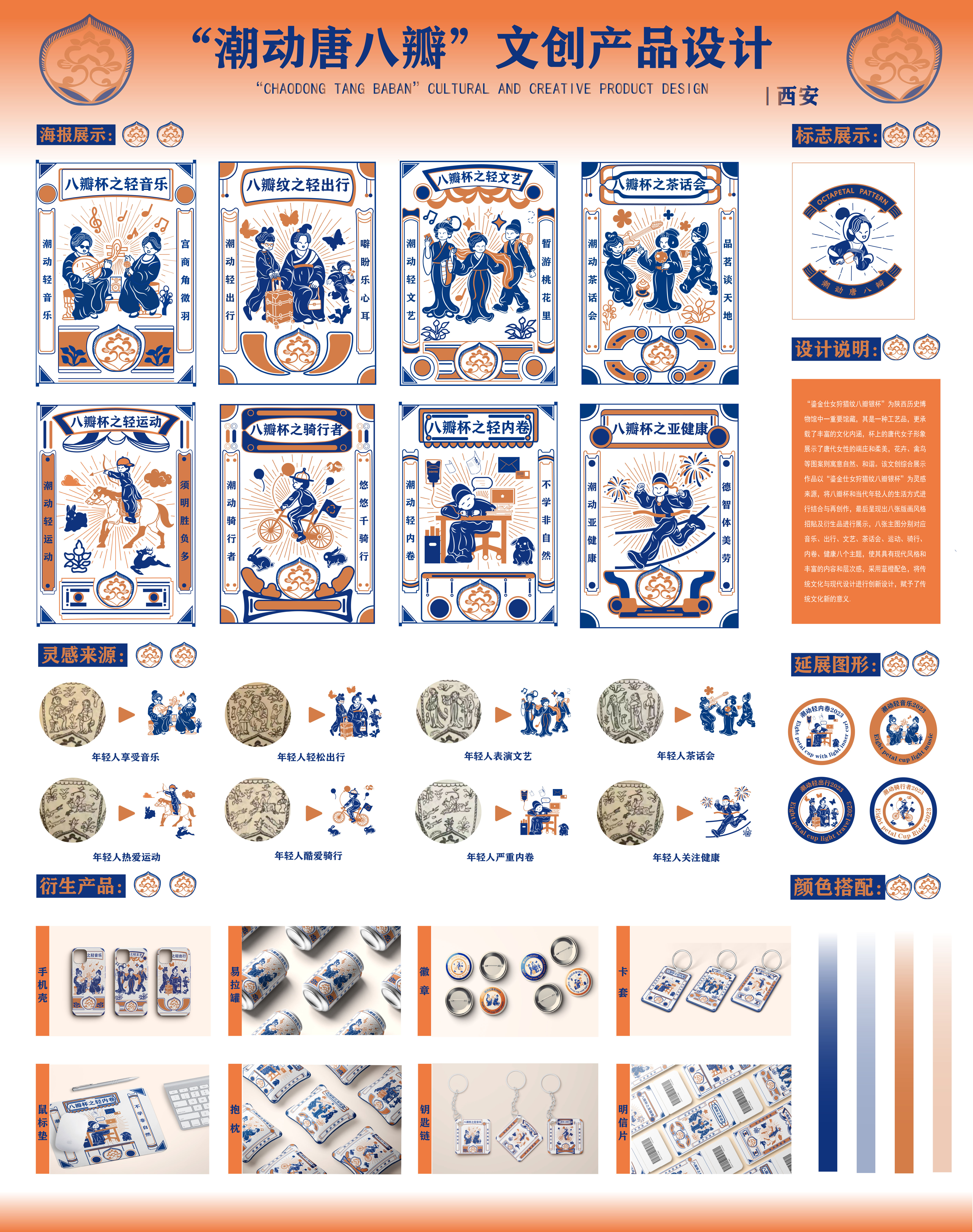 “鎏金仕女狩猎纹八瓣银杯”为陕西历史博物馆中一重要馆藏,该文创综合展示作品以“鎏金仕女狩猎纹八瓣银杯”为灵感来源,将八瓣杯和当代年轻人的生活方式进行结合与再创作,最后呈现出八张版画风格招贴及衍生品进行展示,八张主图分别对应音乐、出行、文艺、茶话会、运动、骑行、内卷、健康八个主题,使其具有现代风格和丰富的内容和层次感,采用蓝橙配色,将传统文化与现代设计进行创新设计,赋予了传统文化新的意义。