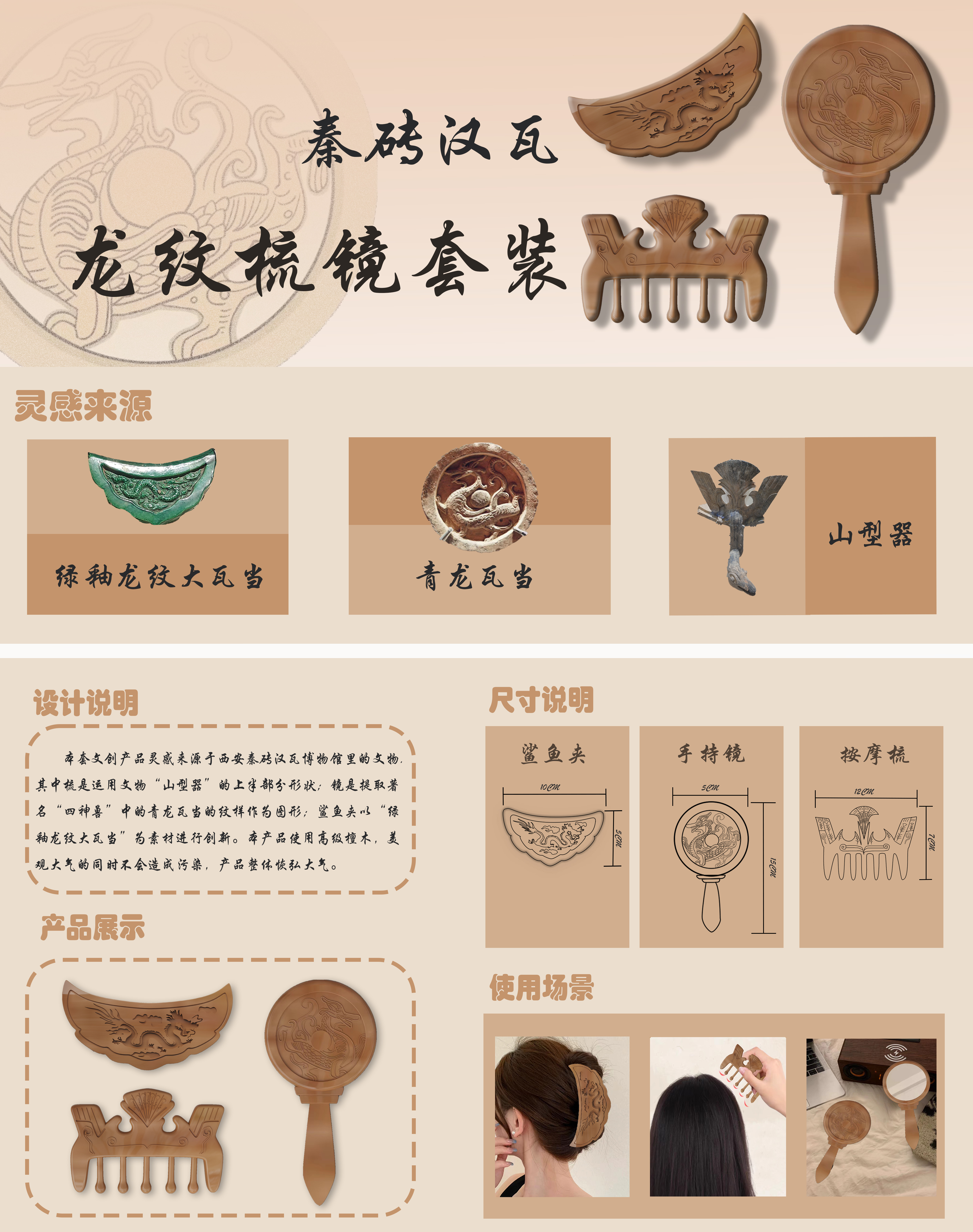 本套文创产品灵感来源于西安秦砖汉瓦博物馆里的文物,其中梳是运用文物“山型器”的上半部分;镜是提取著名“四神兽”中的青龙瓦当的纹样作为图形;鲨鱼夹以“绿釉龙纹大瓦当”为素材进行创新。本产品使用高级檀木为原料,美观大气的同时不会造成污染,产品整体恢弘大气。