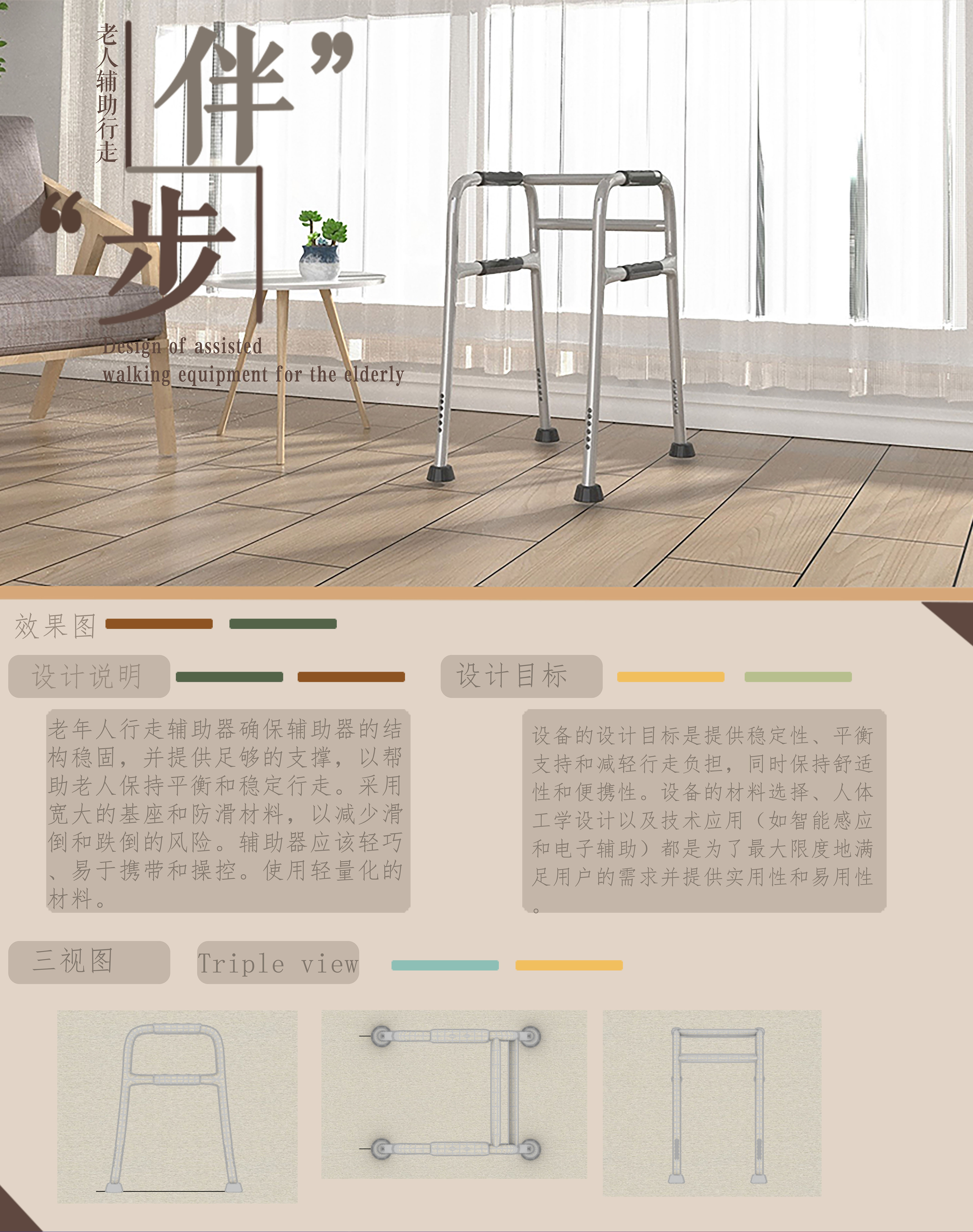 老年人行走辅助器确保辅助器的结构稳固,并提供足够的支撑,以帮助老人保持平衡和稳定行走。采用宽大的基座和防滑材料,以减少滑倒和跌倒的风险。辅助器应该轻巧易于携带和操控。使用轻量化的材料。