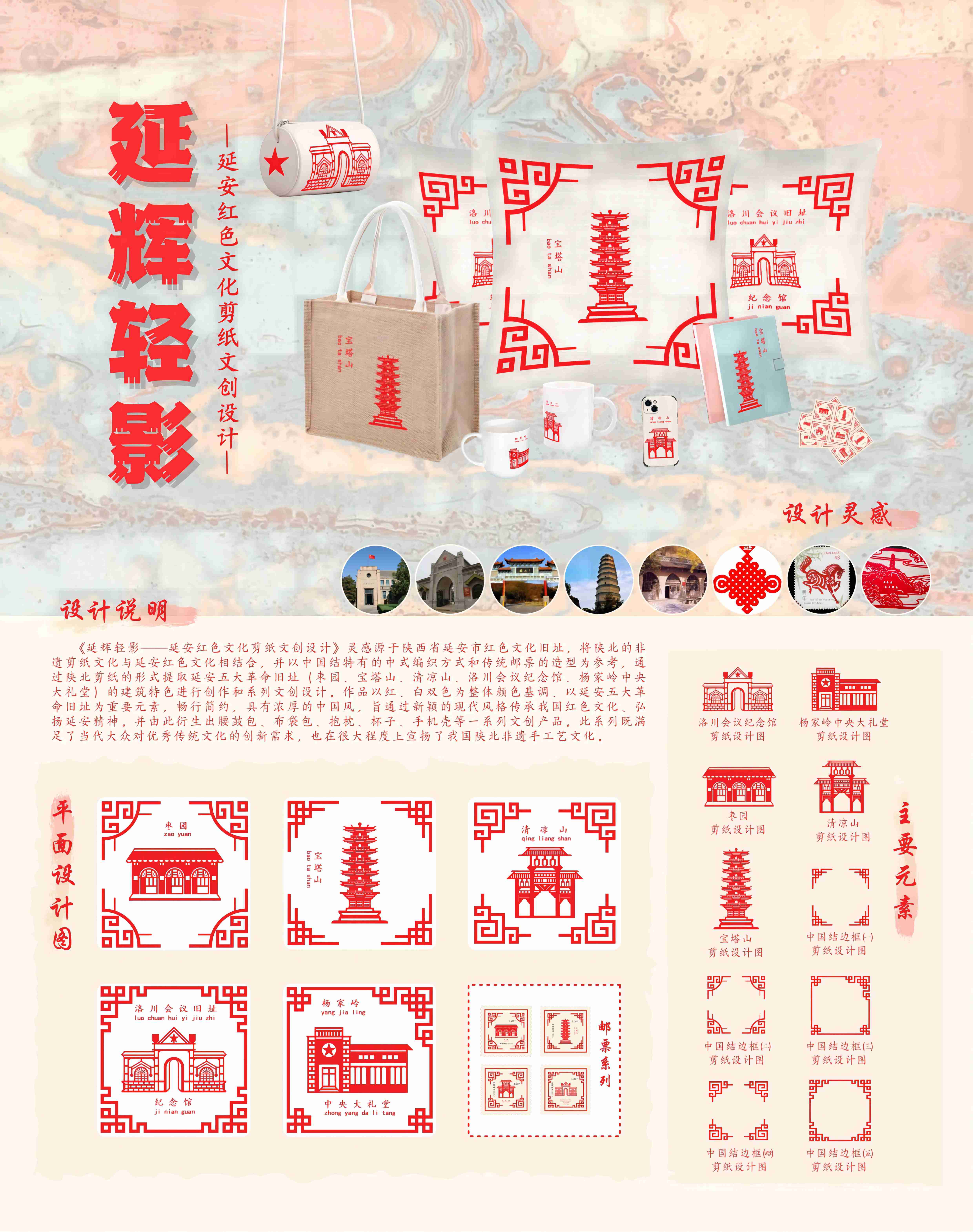 《延辉轻影——延安红色文化剪纸文创设计》系列是将陕北剪纸非遗文化和延安红色文化相结合,以陕北剪纸为依托旨在弘扬延安革命精神,作品呈现的内容是独具特色的五大延安革命旧址,除此之外还设计了一系列的文创产品包括:腰鼓包、布袋包、抱枕、杯子、手机壳、笔记本。此系列既保留了陕北剪纸和延安红色革命旧址的特点,又创造出实用的文创作品,不仅满足了当代青年对优秀传统文化和红色革命精神的需求,同时也达到了实用效果。