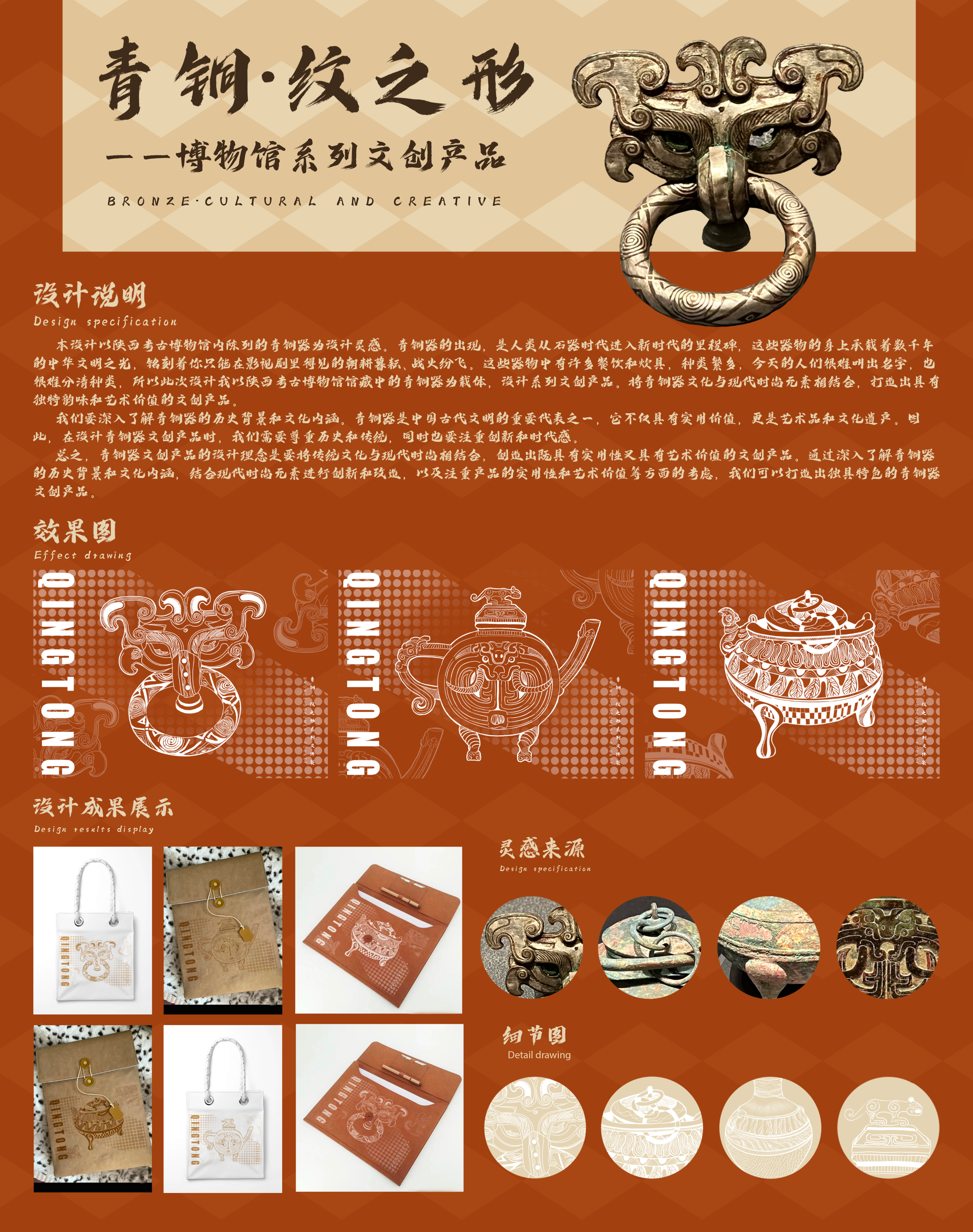 本设计以陕西考古博物馆内陈列的青铜器为设计灵感,结合其中的纹样进行二次创作,运用部分构成方法进行组合排列。用古老的青铜器文化与现代时尚元素相结合,打造出具有独特韵味和艺术价值的文创产品,产品具体为文件袋、手提袋、文件夹等。