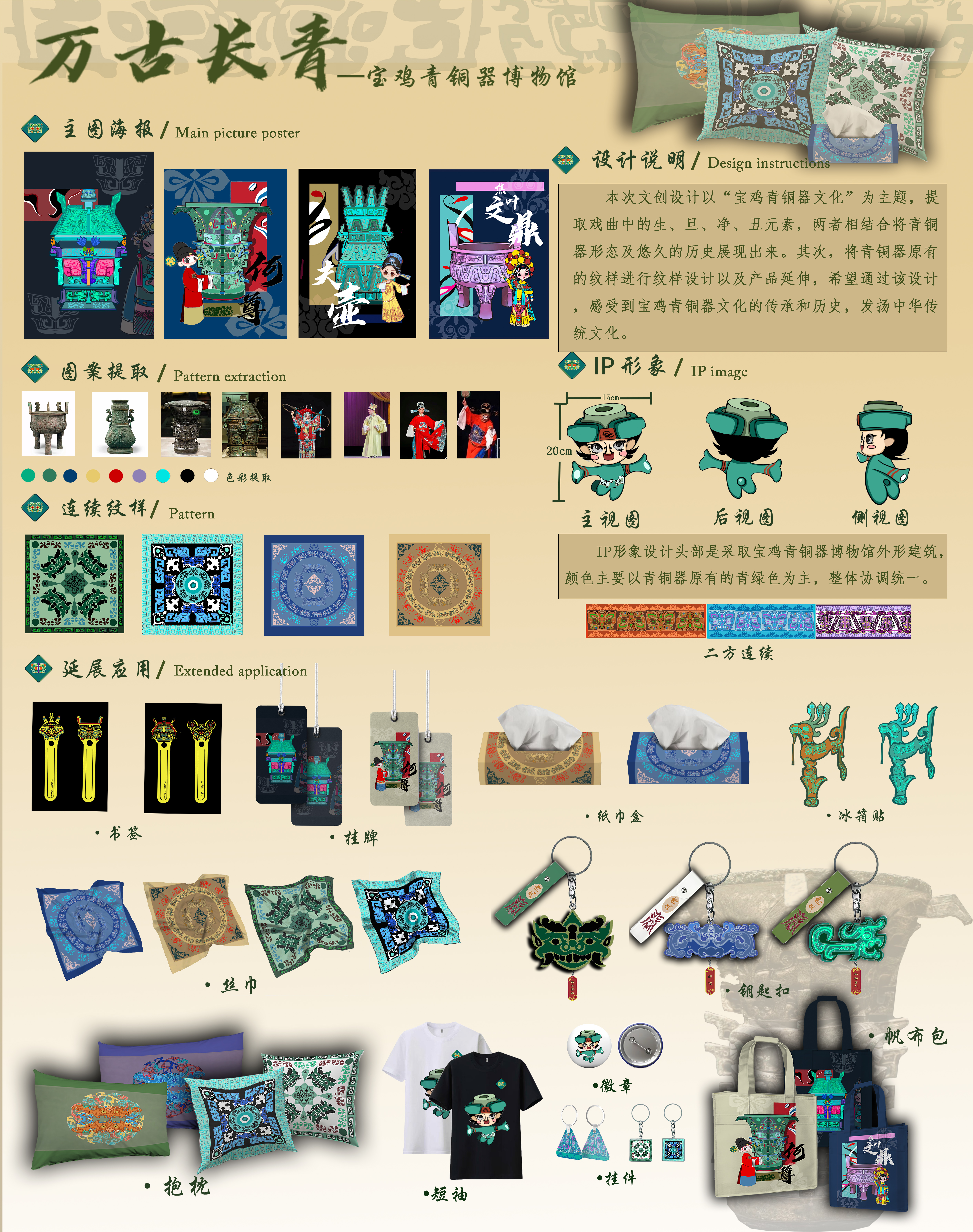 本次文创设计以“宝鸡青铜器文化”为主题,提取戏曲中的生、旦、净、丑元素,两者相结合将青铜器形态及悠久的历史展现出来。其次,将青铜器原有的纹样进行纹样设计以及产品延伸,希望通过该设计,感受到宝鸡青铜器文化的传承和历史,发扬中华传统文化。