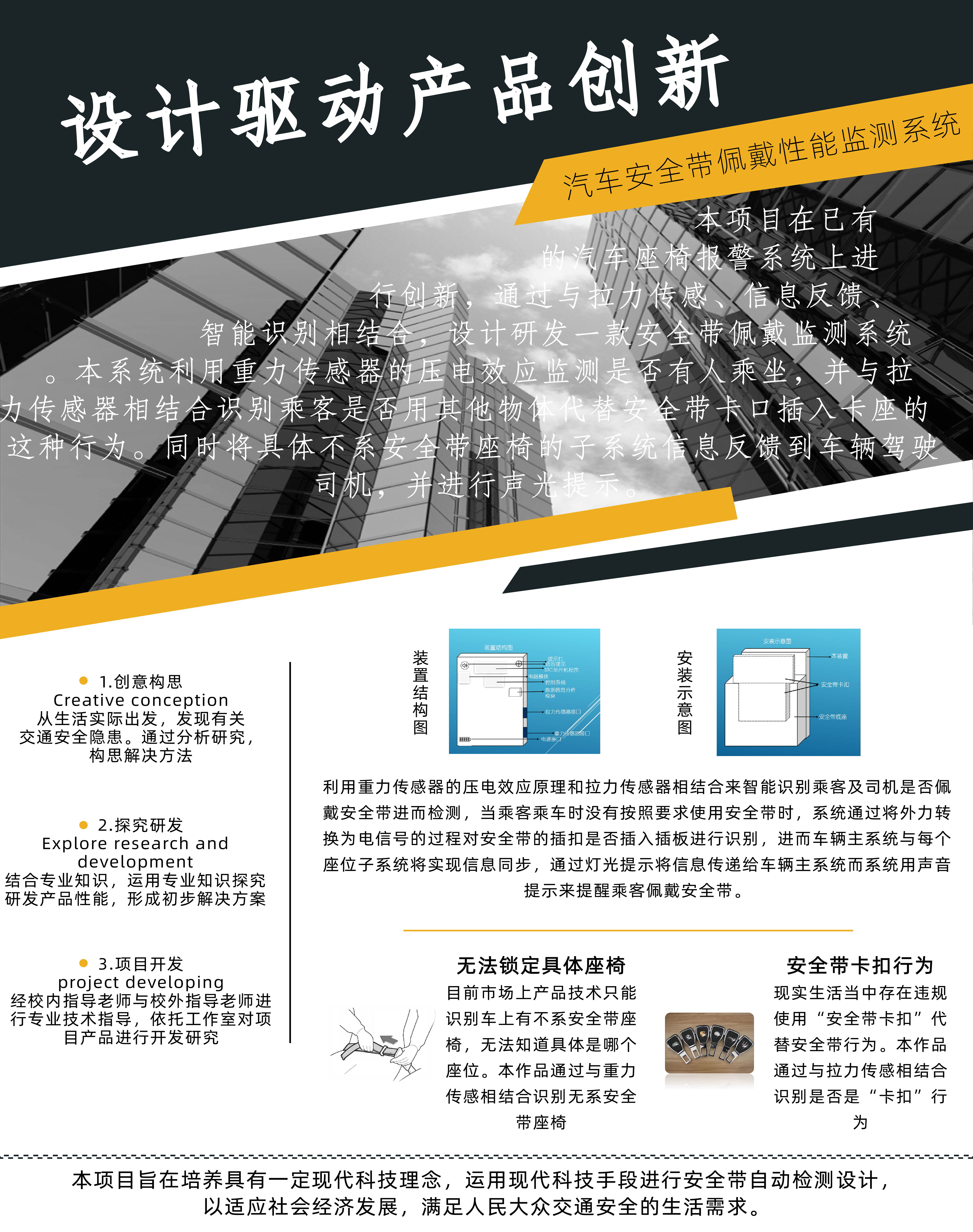 本项目在已有的汽车座椅报警系统上进行创新,本系统利用重力传感器的压电效应监测是否有人乘坐,并与拉力传感器相结合识别乘客是否用其他物体代替安全带卡口插入卡座的这种行为。同时将具体不系安全带座椅的子系统信息反馈到车辆驾驶司机,并进行声光提示。本产品旨在培养具有一定现代科技理念,运用现代科技手段进行安全带自动检测设计,以适应社会经济发展,满足人民大众交通安全的生活需求。