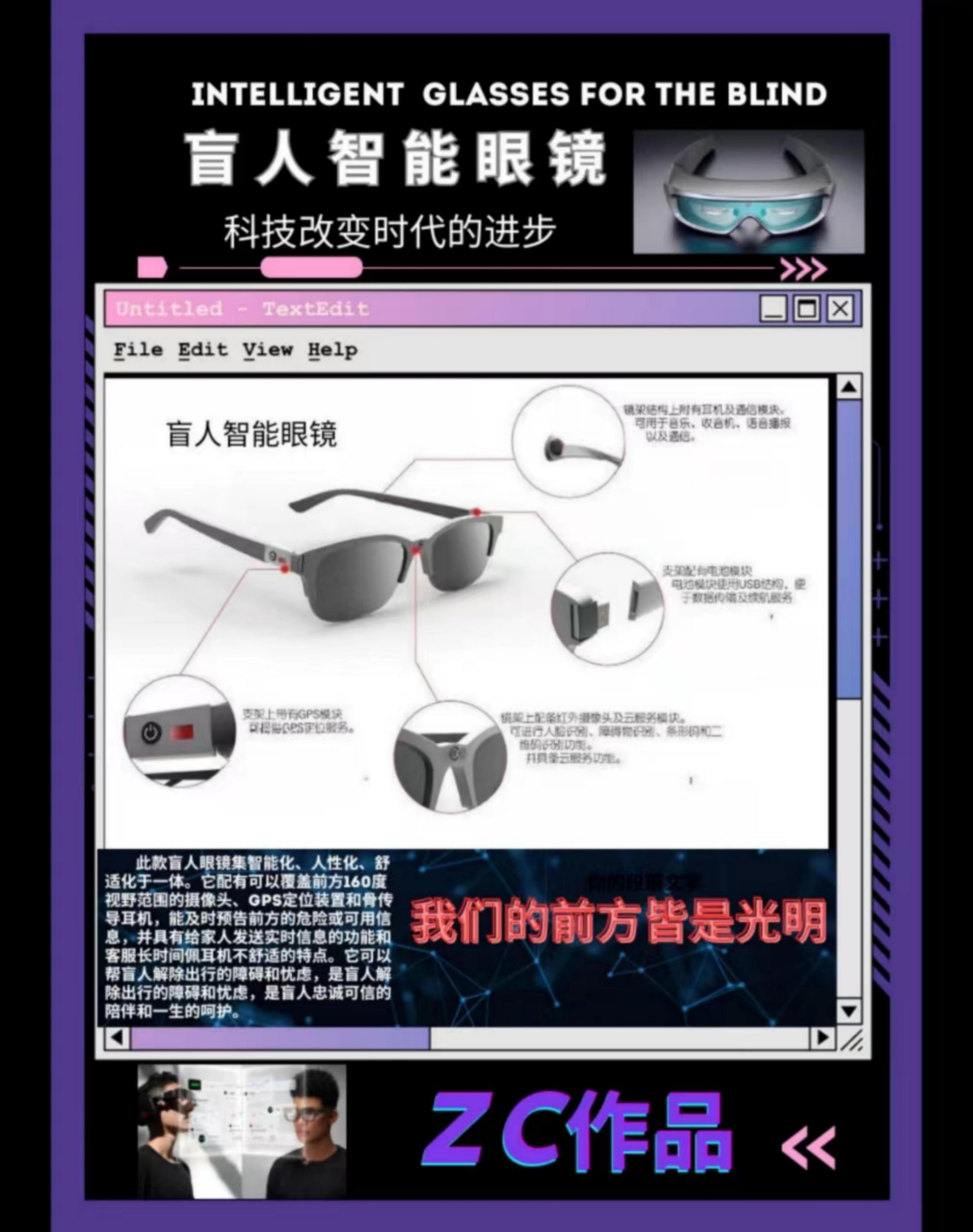 此款盲人眼镜集智能化、人性化、舒适化于一体。它配有可以覆盖前方160度视野范围的摄像头、Gps定位装置和骨传导耳机,能及时预告前方的危险或可用信息,并具有给家人发送时实信息的功能和克服长时间戴耳机不舒适的特点。它可以帮盲人解除出行的障碍和忧虑,是盲人忠诚可信的陪伴和一生的呵护。