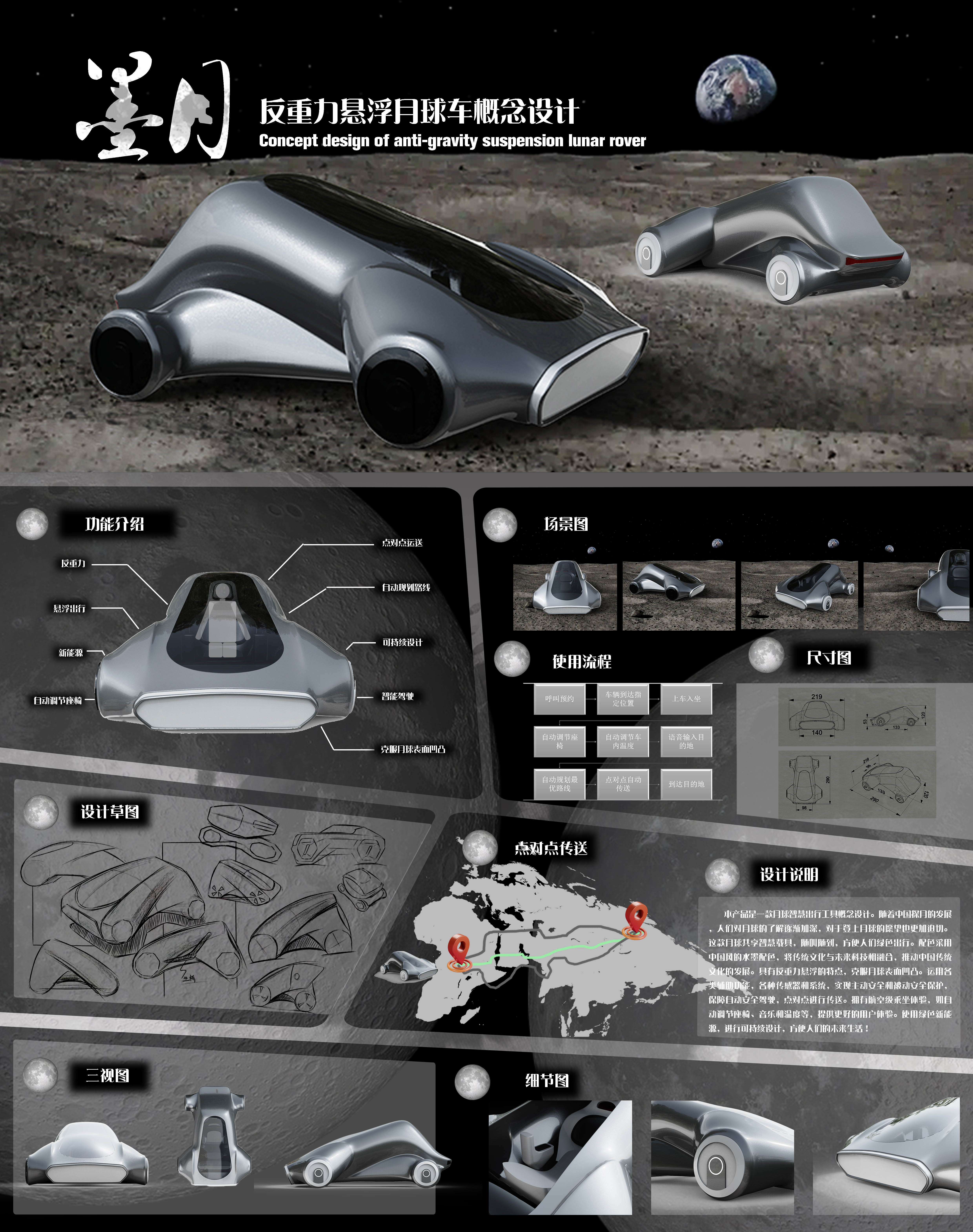 本设计是一款月球共享智慧出行工具。随着中国探月工程的发展,我们开始畅想在月球上的智慧出行方案。产品配色采用中国风的水墨配色,将传统文化与未来科技相融合。产品使用反重力悬浮技术可以克服月球表面凹凸。运用相关辅助功能和传感器系统,实现主动安全和被动安全保护,保障自动安全驾驶,点对点进行传送。拥有航空级乘坐体验,如自动调节座椅、音乐和温度等。使用绿色新能源,进行可持续设计,方便人们的未来生活!