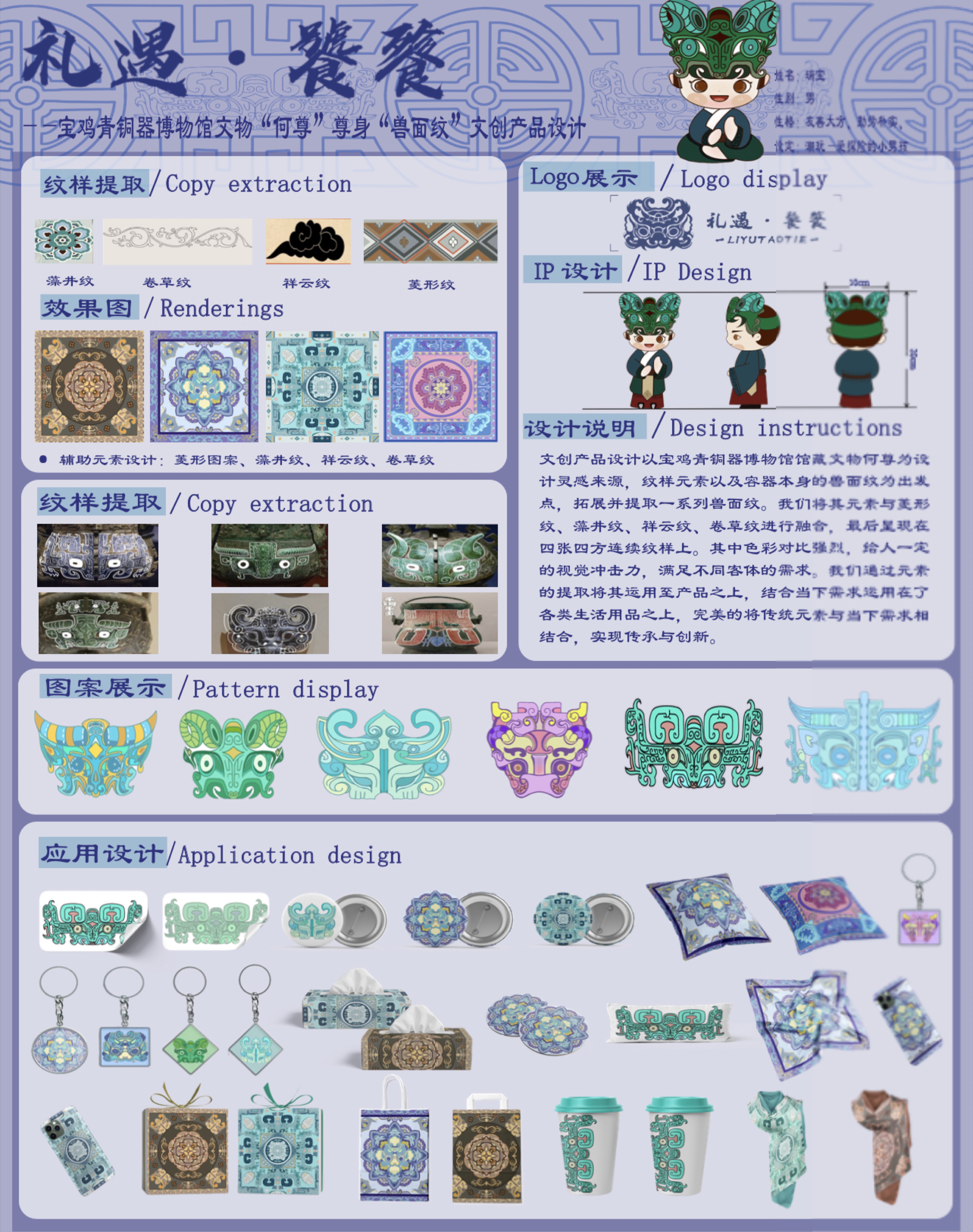 文创产品设计以宝鸡青铜器博物馆馆藏文物何尊为设计灵感来源,纹样元素以及容器本身的兽面纹为出发点,拓展并提取一系列兽面纹。我们将其元素与菱形纹、藻井纹、祥云纹、卷草纹进行融合,最后呈现在四张四方连续纹样上。其中色彩对比强烈,给人一定的视觉冲击力,满足不同客体的需求。我们通过元素的提取将其运用至产品之上,结合当下需求运用在了各类生活用品之上,完美的将传统元素与当下需求相结合,实现传承与创新。