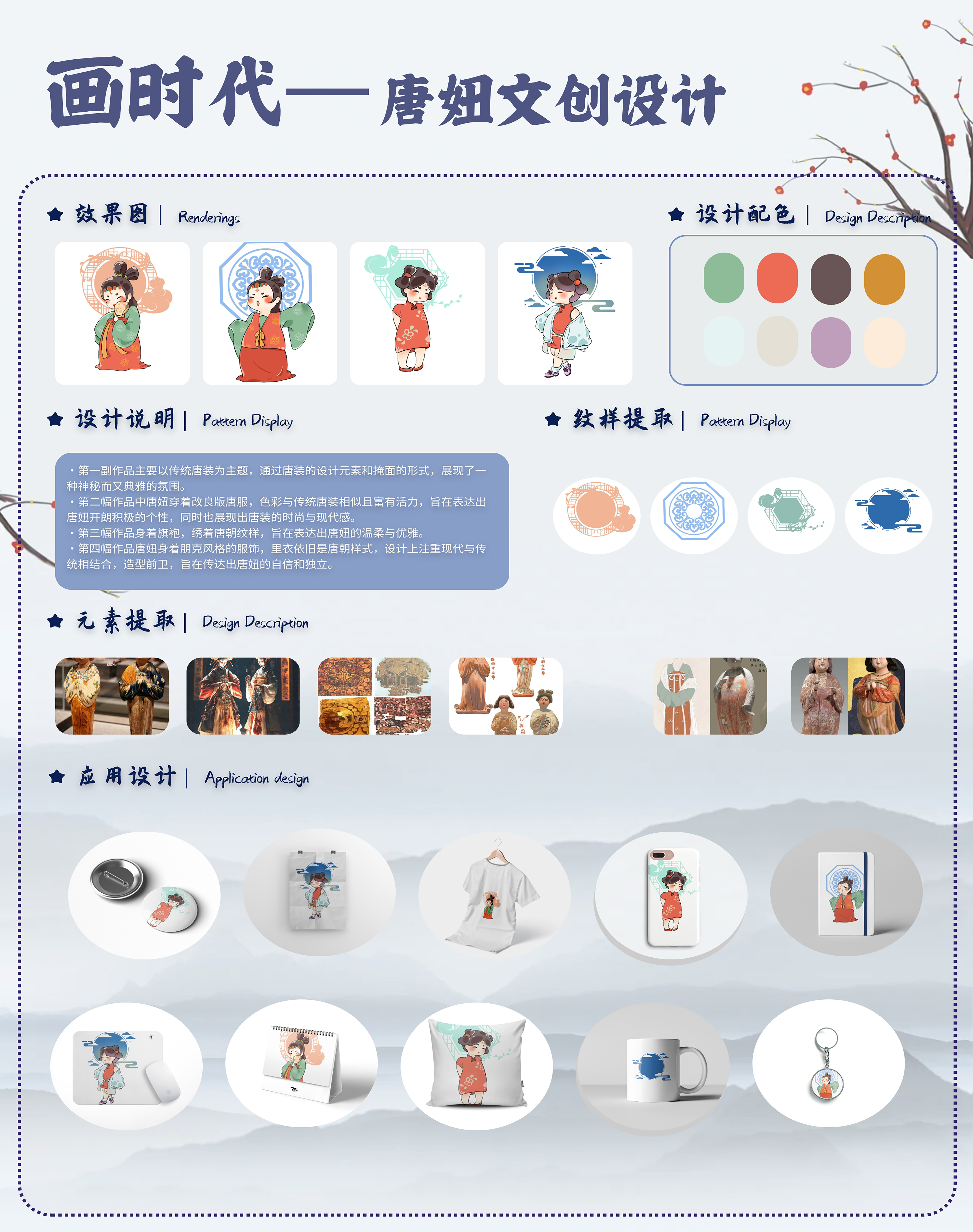 四幅作品都以唐妞为主题,加以时代背景元素,两者相融合使唐妞更贴近真实,画风以q版可爱为主,展现唐妞的活力自信,四幅着装分别注入时代特色,体现传统文化与时俱进的特点。