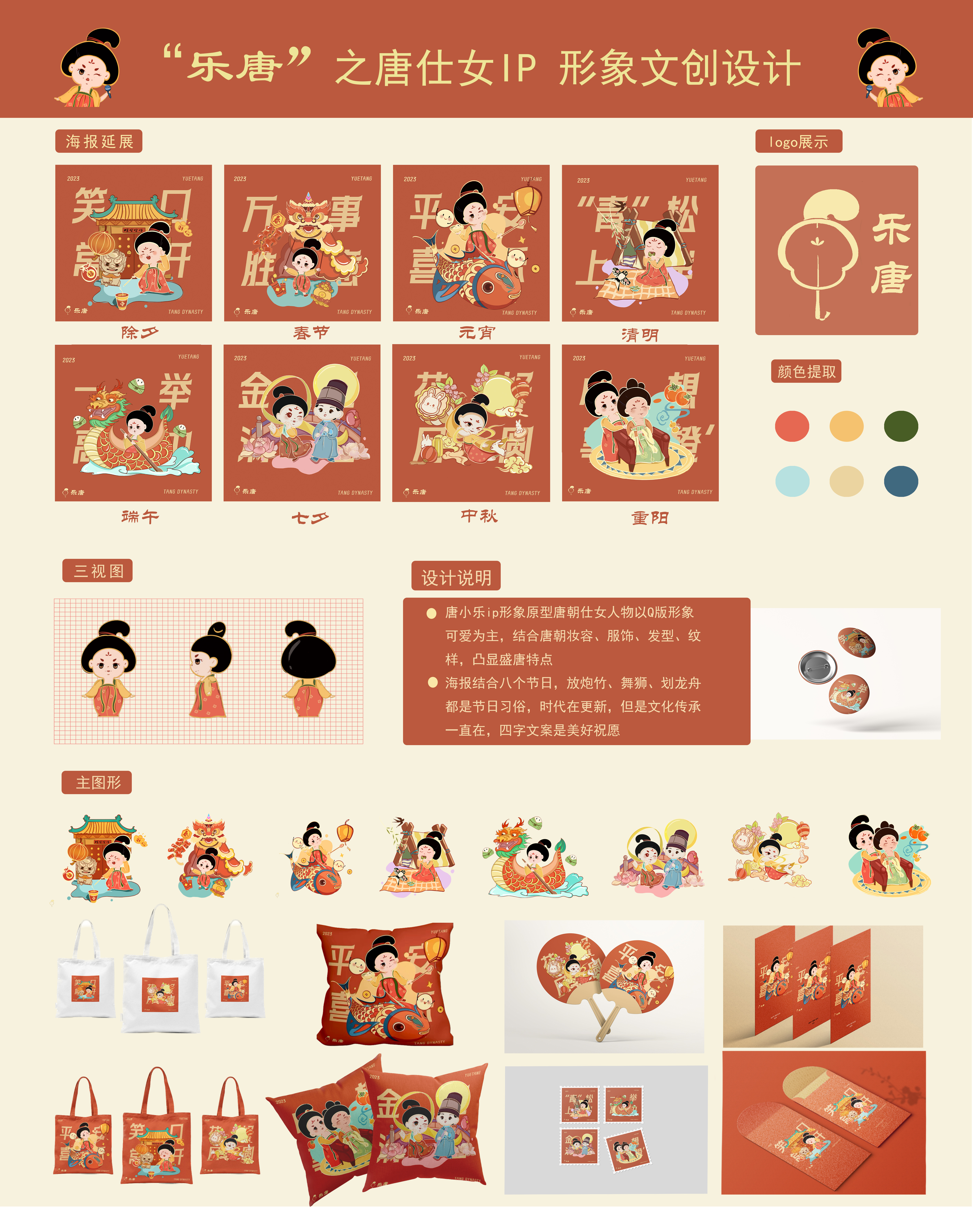 唐仕女IP文创设计 唐小乐ip形象原型唐朝仕女人物以Q版形象可爱为主,结合唐朝妆容、服饰、发型、纹样,凸显盛唐特点。海报结合八个节日,放炮竹、舞狮、划龙舟 都是节日习俗,时代在更新,但是文化传承一直在,四字文案是美好祝愿。