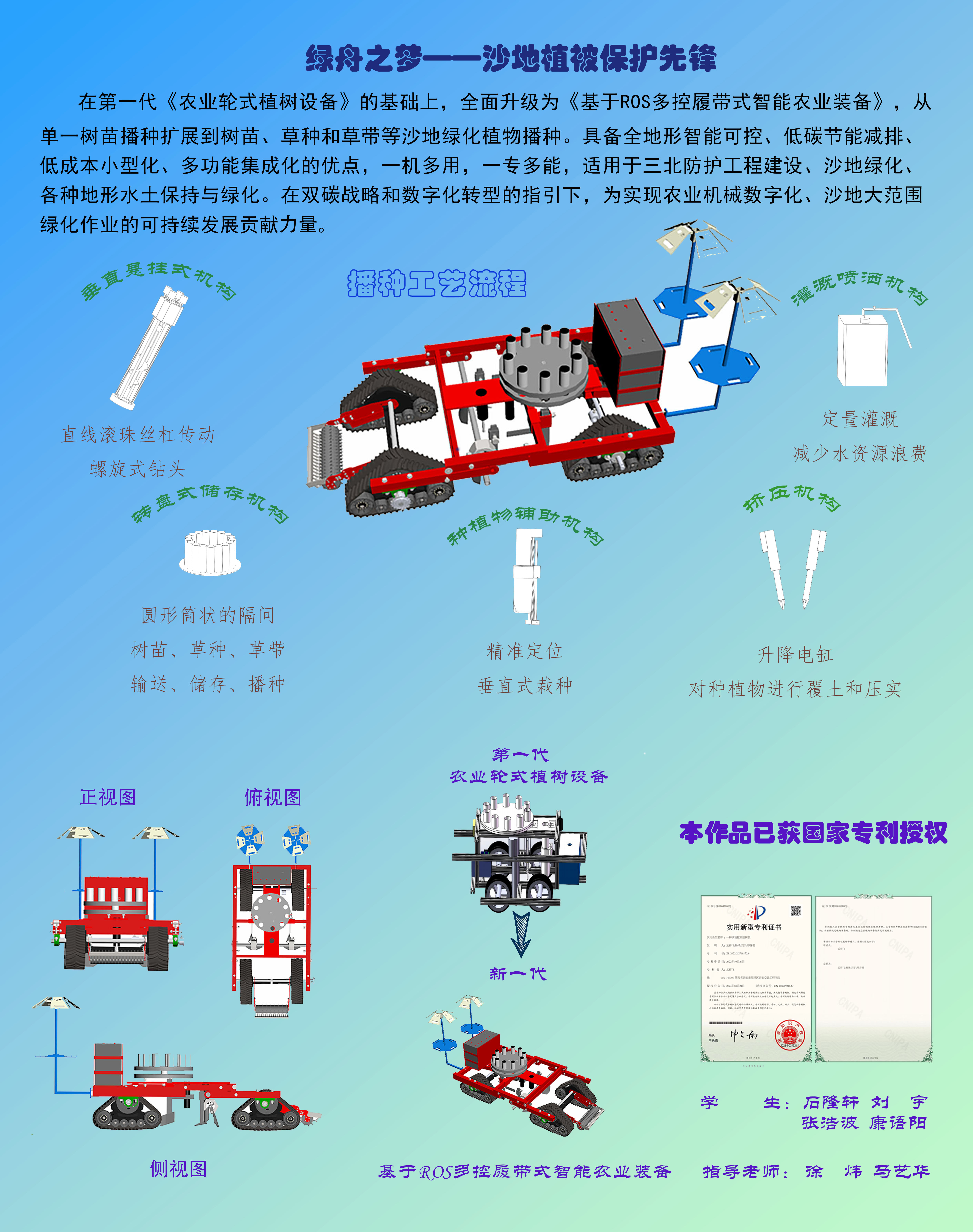 在原自主发明的第一代《农业轮式植树设备》的基础上,全面升级为《基于ROS多控履带式智能农业装备》,从单一树苗播种扩展到树苗、草种和草带等沙地绿化植物播种。具备全地形智能可控、低碳节能减排低成本小型化、多功能集成化的优点,一机多用,一专多能,适用于三北防护工程建设、沙地绿化、各种地形水土保持与绿化。在双碳战略和数字化转型的指引下,为实现农业机械数字化、沙地大范围绿化作业的可持续发展贡献力量。