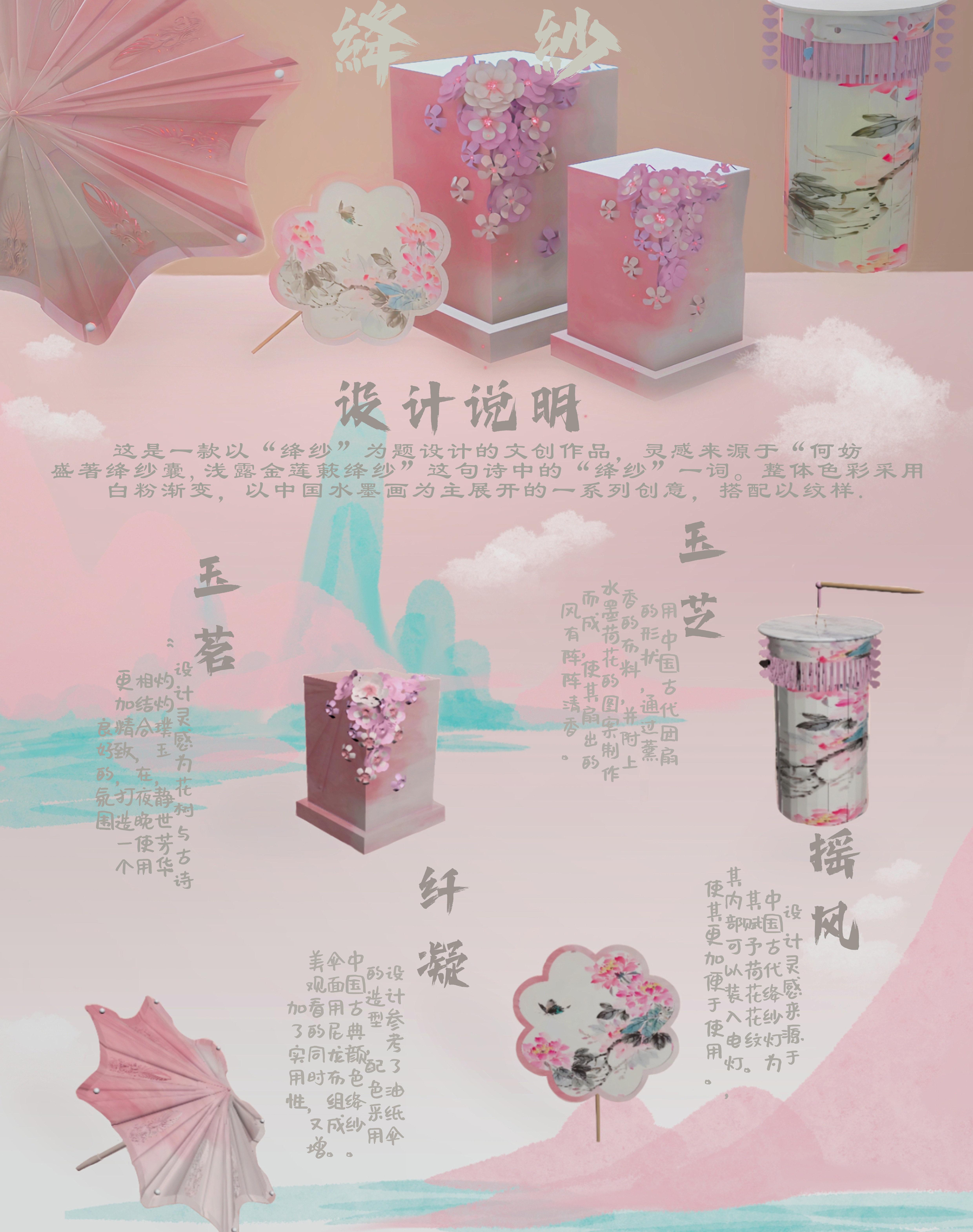 作品由两盏灯,一把伞,一柄扇子组成。它们美观与实用性并有,且实用性比较强,在日常生活中也可以用到。使用材料皆为现代材料,有较好的使用效。伞可以用来遮阳也可以用来挡雨,扇子在夏天必不可少,一盏灯可以在室内当作派件,另一盏灯,用于手提可以在黑夜中赶路使用。