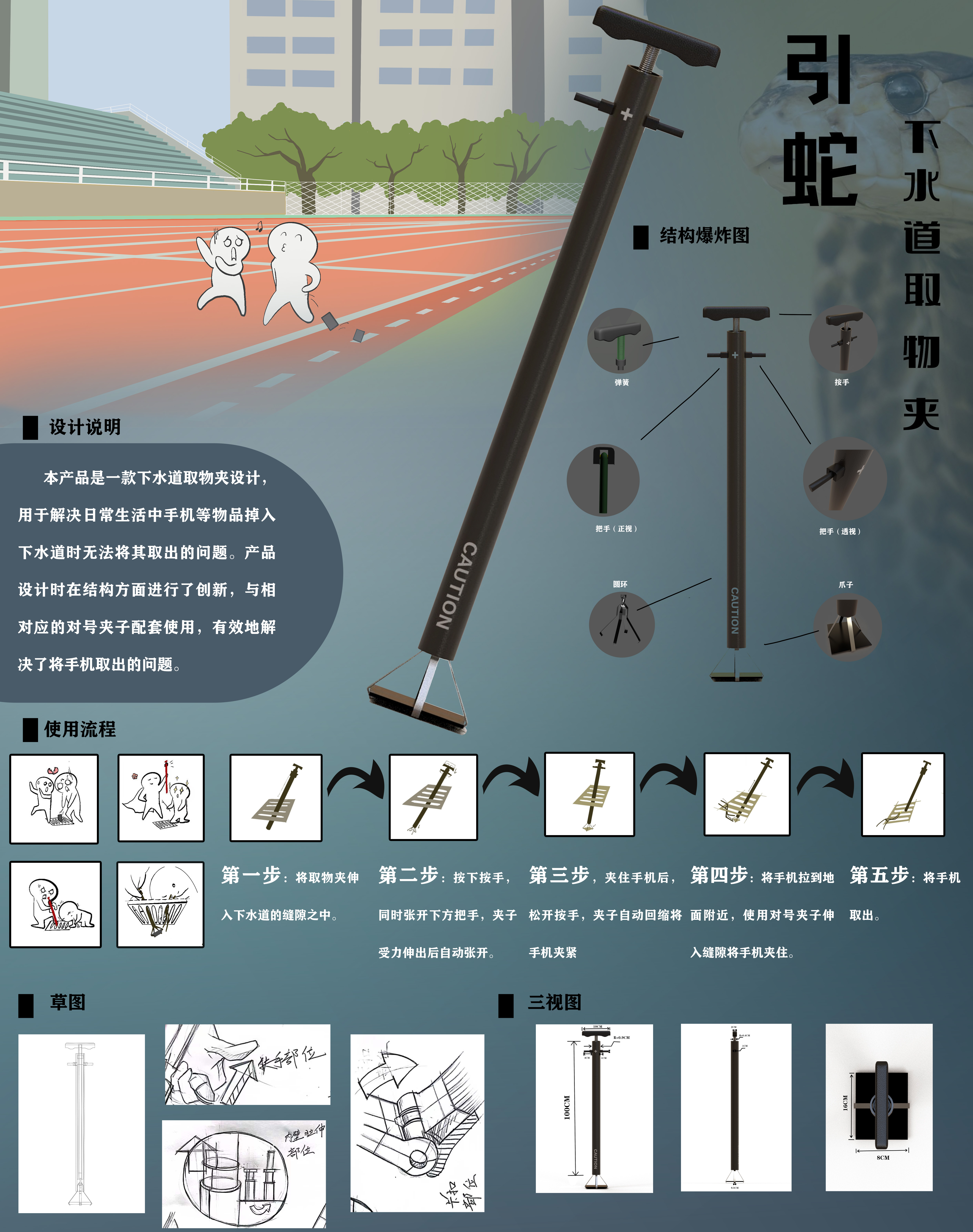 为解决生活中手机等物品不小心掉入下水道等缝隙较小的地方等问题,我们小组设计了这款下水道取物夹。本产品利用自动铅笔原理,使用时向下按“按手”,爪子伸出后自动弹开,夹到手机后向上拉“按手”,爪子回缩将手机夹紧,然后向上拉到缝隙处,用夹子将手机夹出。本产品取名为“引蛇”意味着“引蛇出洞”。