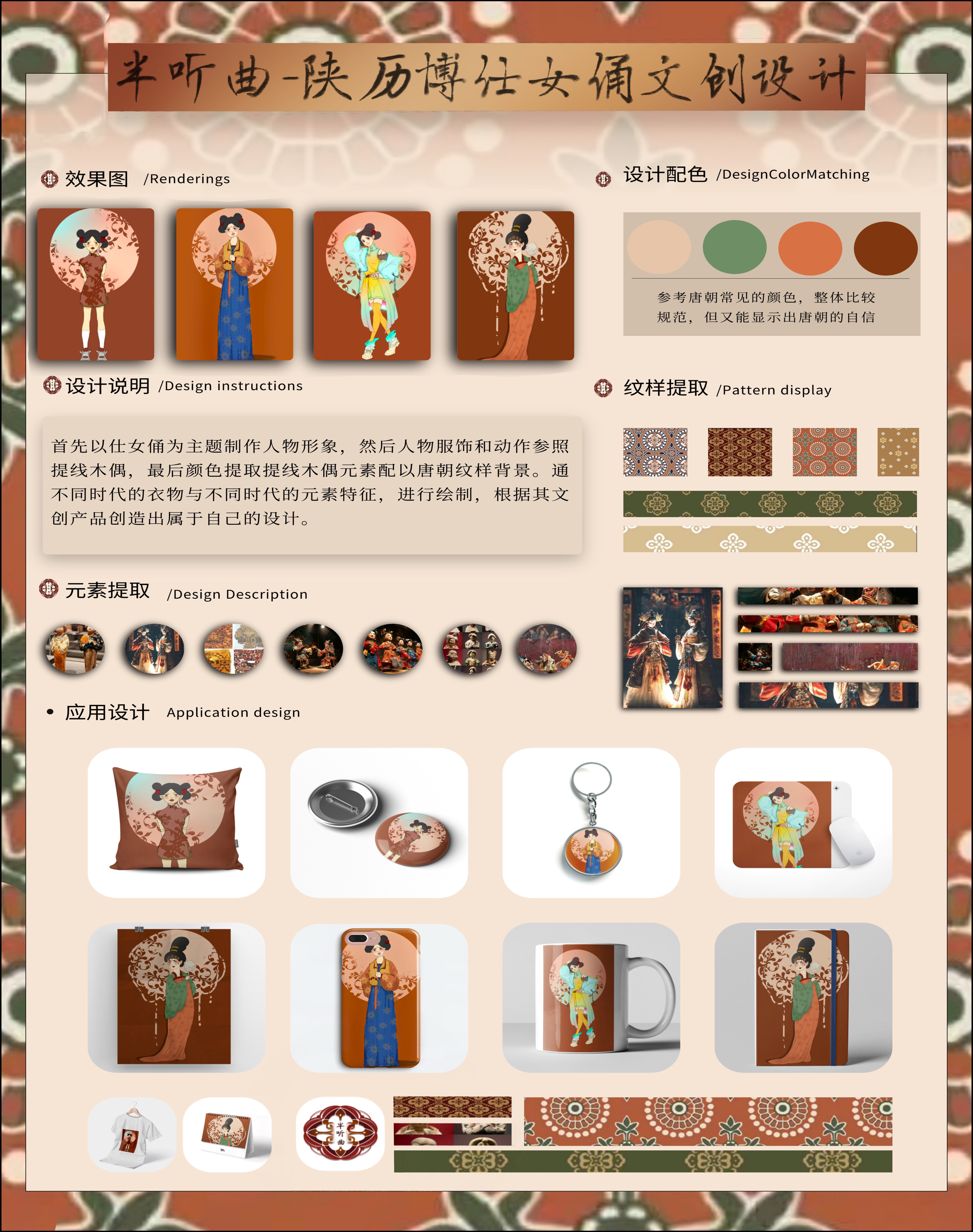首先以仕女俑为主题制作人物形象,然后人物服饰和动作参照提线木偶,最后颜色提取提线木偶元素配以唐朝纹样背景。通不同时代的衣物与不同时代的元素特征,进行绘制,根据其文创产品创造出属于自己的设计,做出让大众喜欢的文创产品。