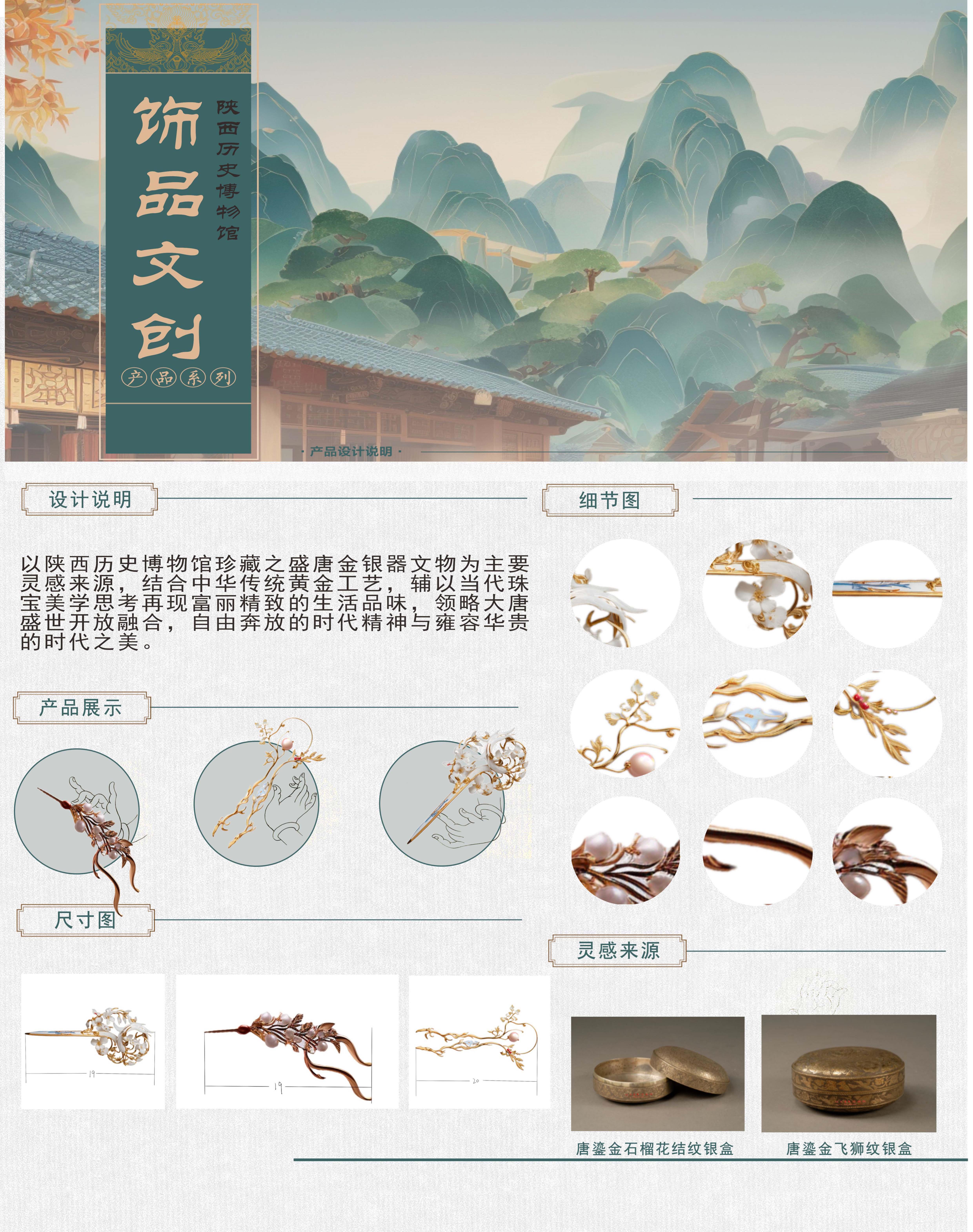 这套产品以陕西历史博物馆珍藏之盛唐金银器文物为主要灵感来源,结合中华传统黄金工艺,辅以当代珠宝美学思考再现富丽精致的生活品味,领略大唐盛世开放融合,自由奔放的时代精神与雍容华贵的时代之美。