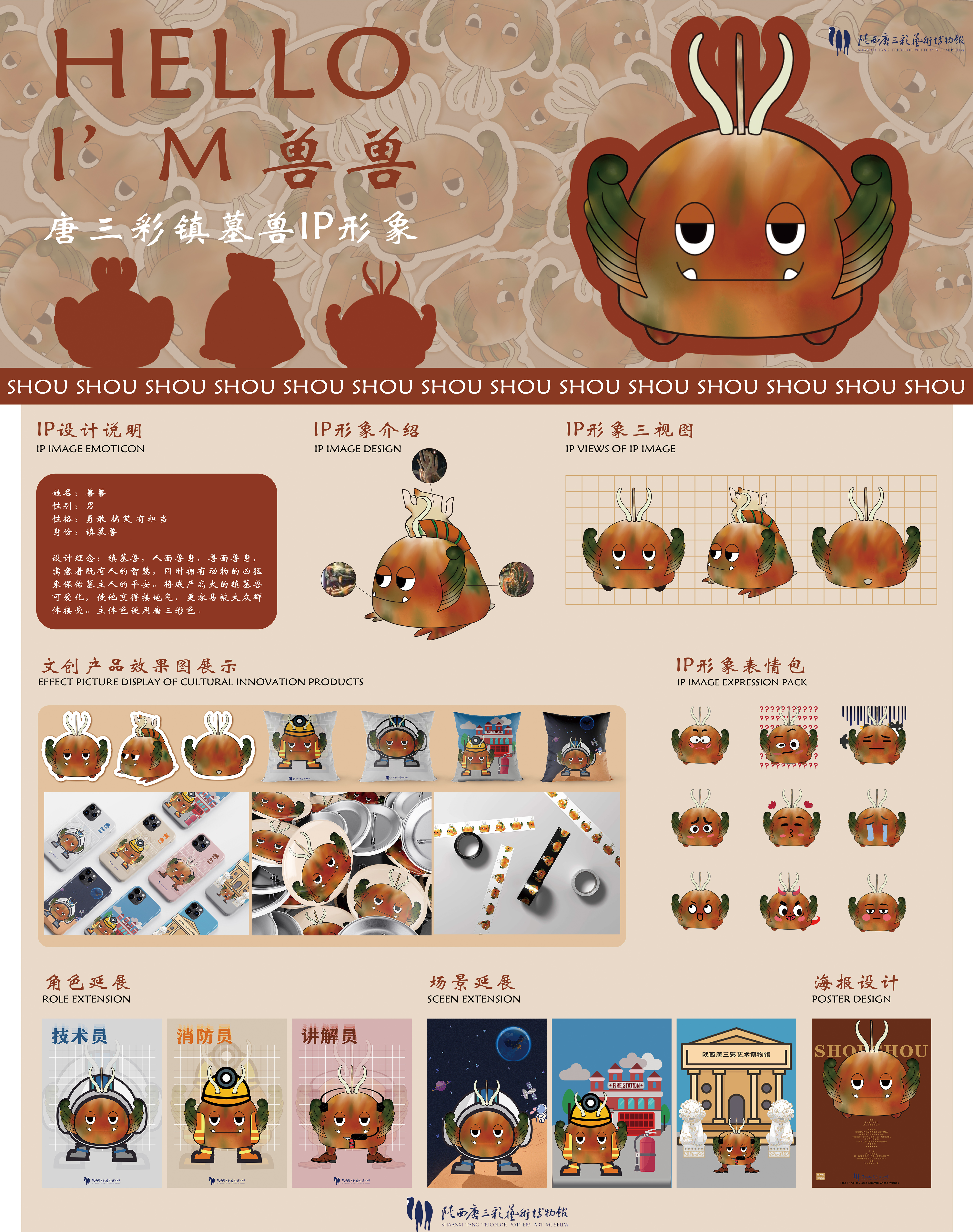 镇墓兽,人面兽身,兽面兽身,寓意着既有人的智慧,同时拥有动物的凶猛来保佑墓主人的平安。将威严高大的镇墓兽可爱化,使他变得接地气,更容易被大众群体接受。主体色使用唐三彩色。